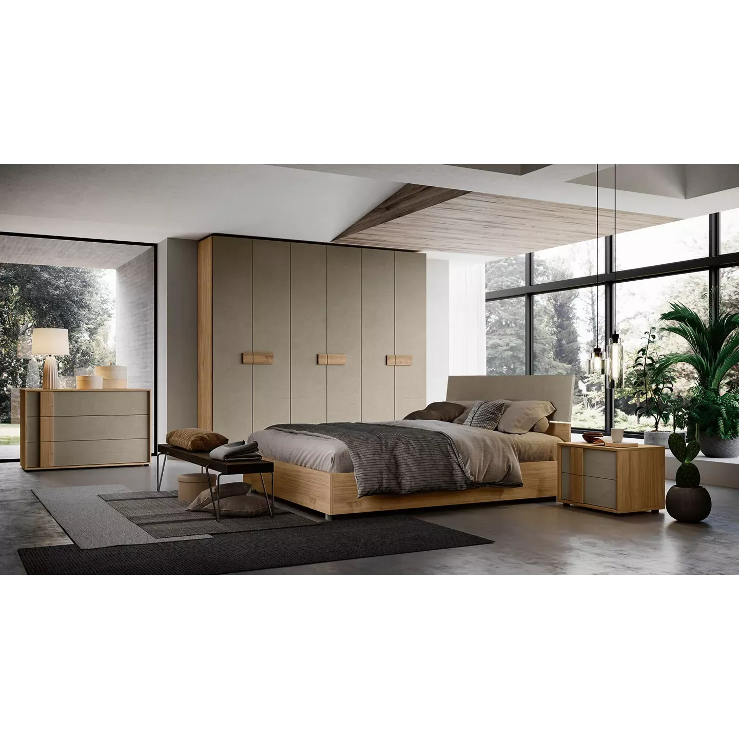 Camera matrimoniale con armadio battente e letto contenitore, Noce biondo e Argilla