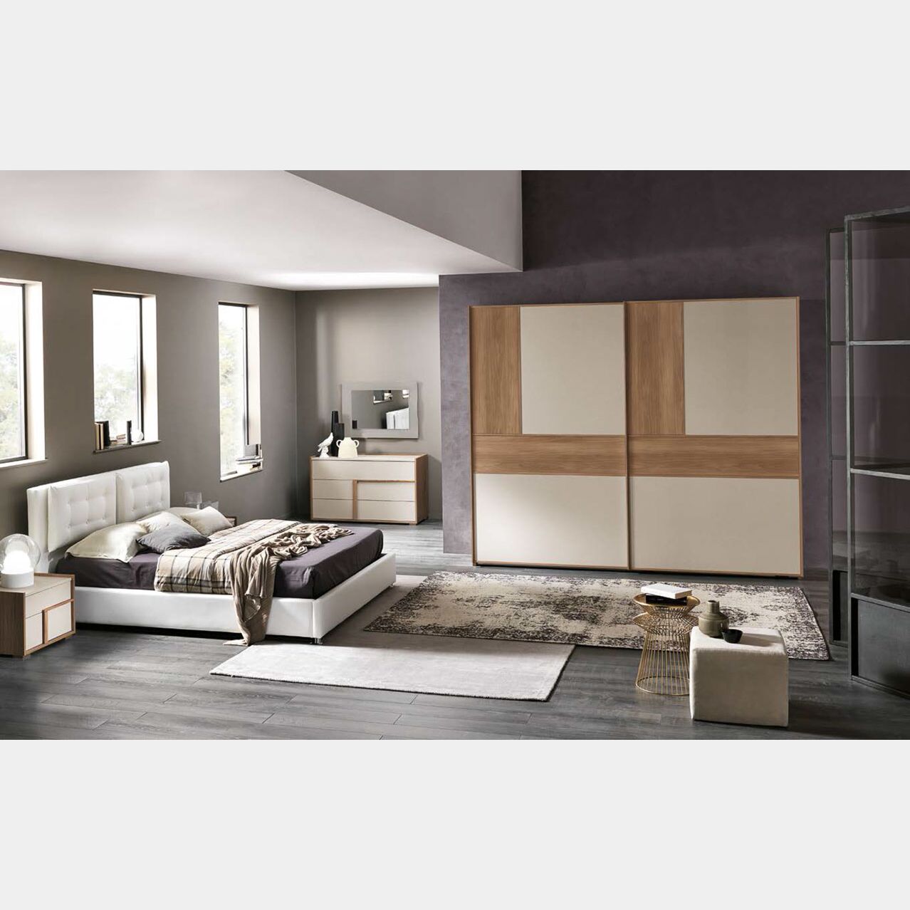 La camera matrimoniale è proposta con armadio con scocca in Noce naturale, così come gli inserti presenti nelle ante e le maniglie. I frontali invece si presentano in un'elegante finitura Cachemire, che si contrappone delicatamente alla tinta materica. Grazie alla possibilità di personalizzare le finiture di scocca e frontali è possibile creare una composizione in perfetta armonia con il proprio ambiente ed i propri gusti. Sono disponibili finiture materiche come il Noce bianco, Noce naturale, melamici Cachemire e Grigio londra oppure decor Calce.