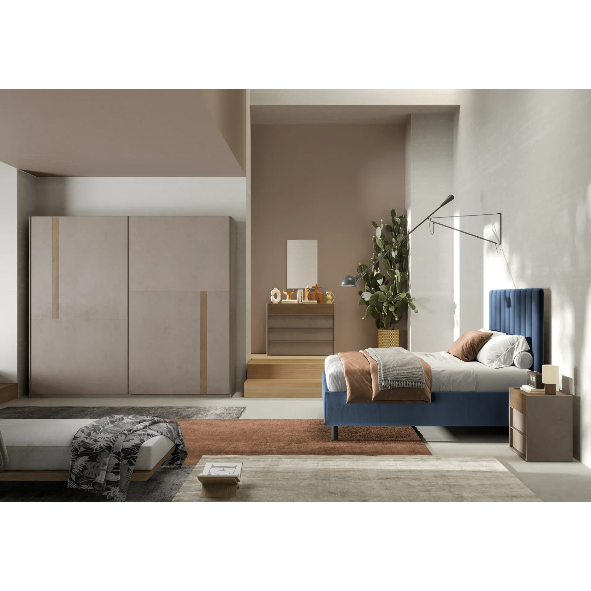 La camera da letto è composta da un armadio a 2 ante scorrevoli, un letto in velluto Blu mare ed una coppia di comodini in Bronzo e Mercure. Scopri tutta la collezione Mondo!