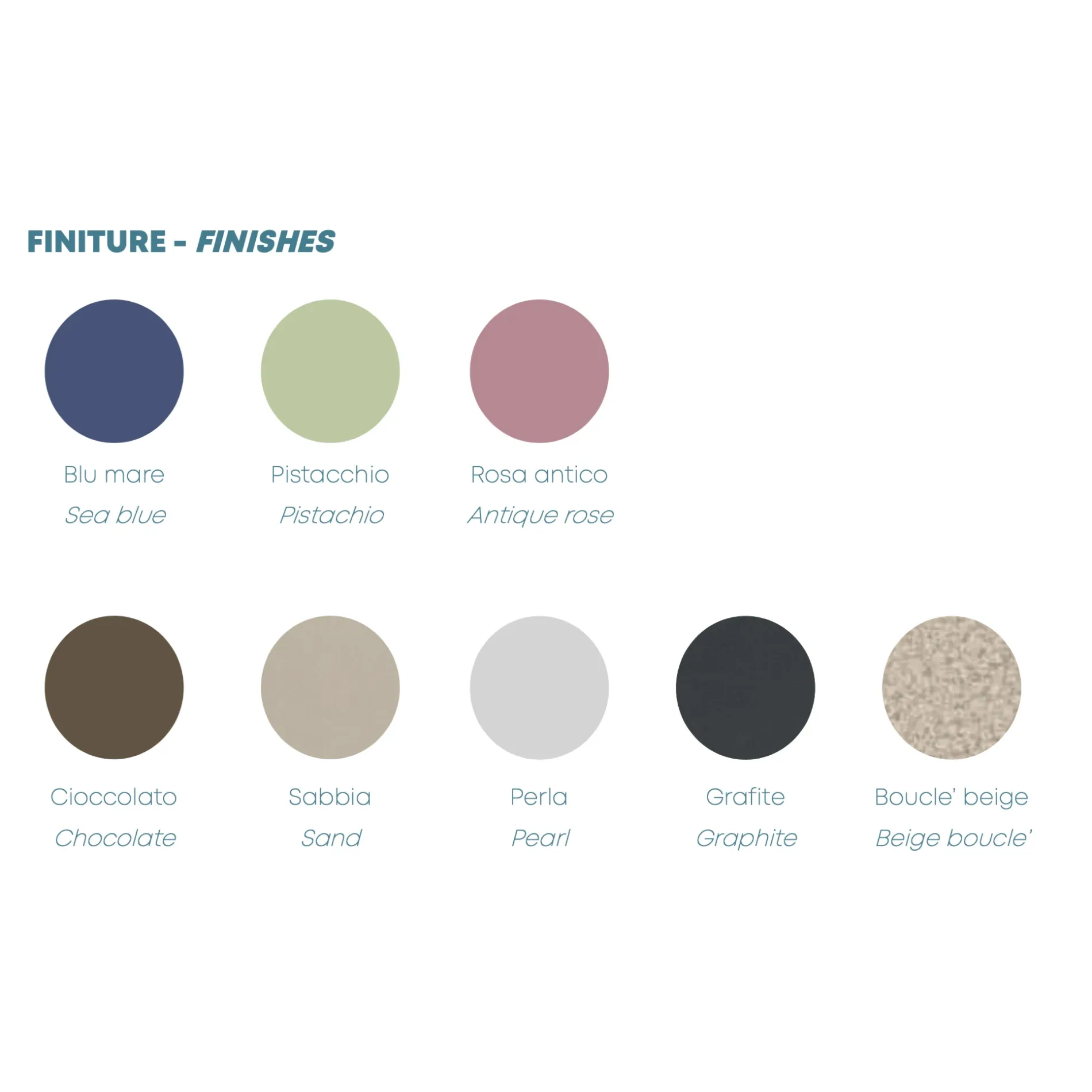 I comodini sono dotati di tre cassetti e sottili maniglie in tinta, struttura e frontali inferiori sono in Bronzo, il top ed il primo frontale sono in una calda tinta legno: il Mercure.