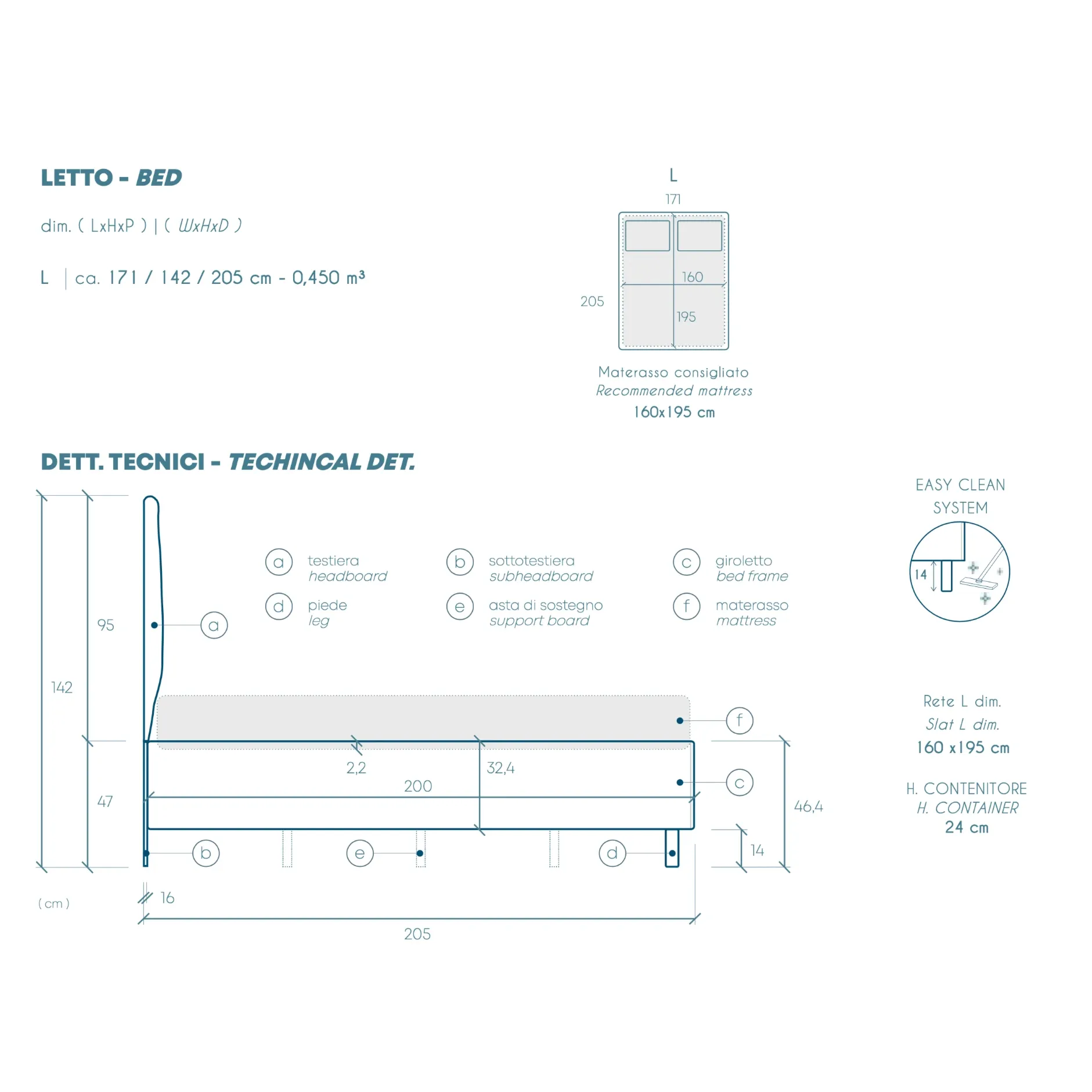 Il letto supporta rete e materasso (non inclusi) dimensioni 160x195.