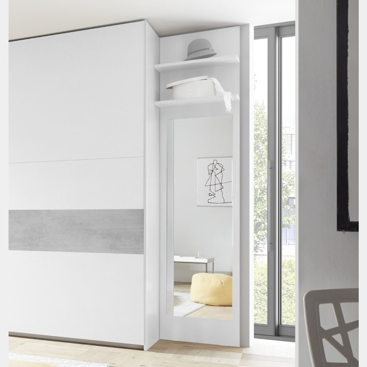 Armadio moderno a 2 ante scorrevoli (220x218)La struttura è bianca opaca in materiale melaminico con fascia orizzontale beton, l'interno dell'armadio è in tessuto. I ripiani interni sono con spessore 30mm in finitura tessuto. All'armadio è possibile aggiungere un mondo di optional, quali ripiani interni 30mm, cassettiera, kit luce 2 led con accensione automatica all'apertura delle ante e scafalatura interna a 5 ripiani.