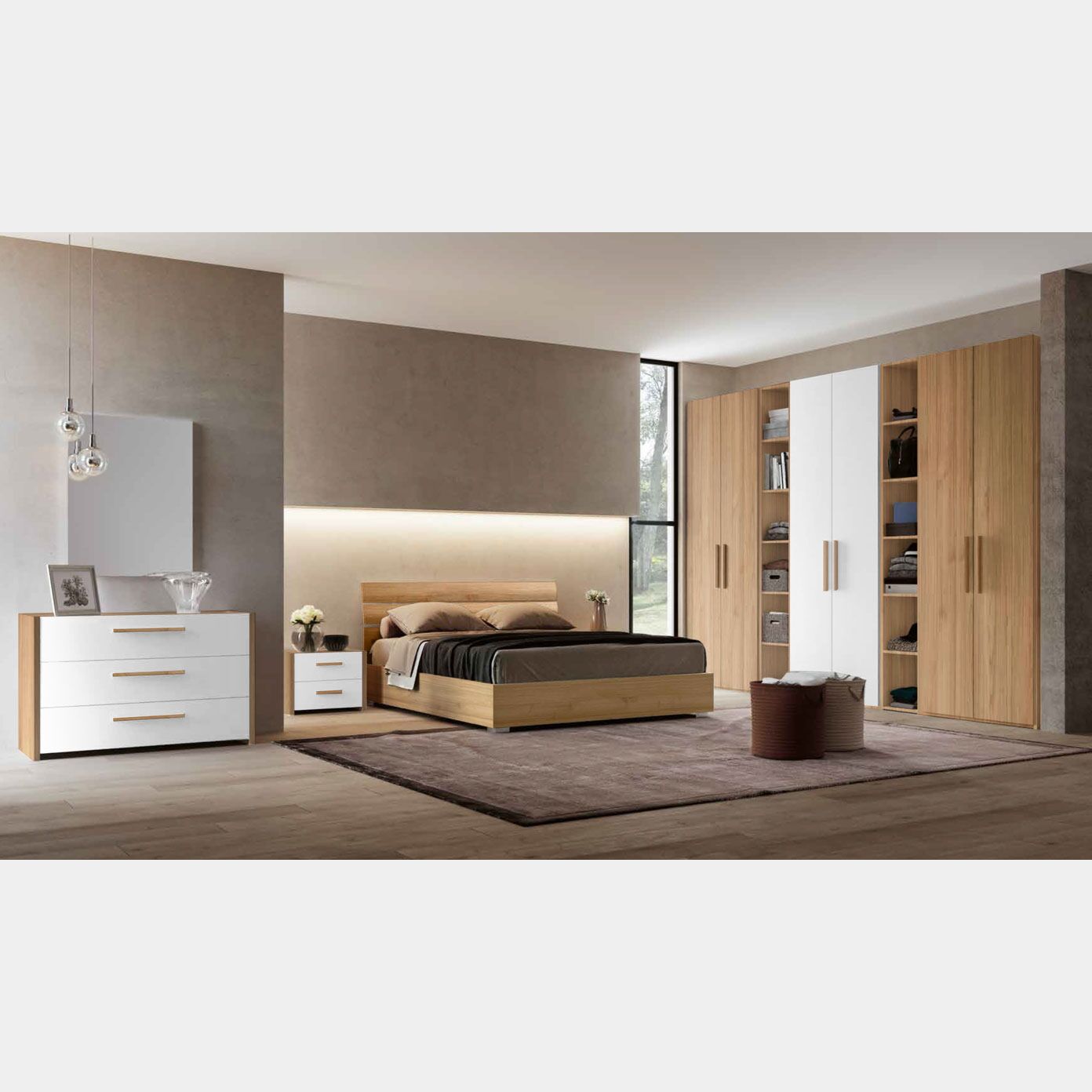 La camera da letto è composta da armadio con librerie, letto, coppia di comodini e comò, è possibile aggiungere la specchiera verticale.