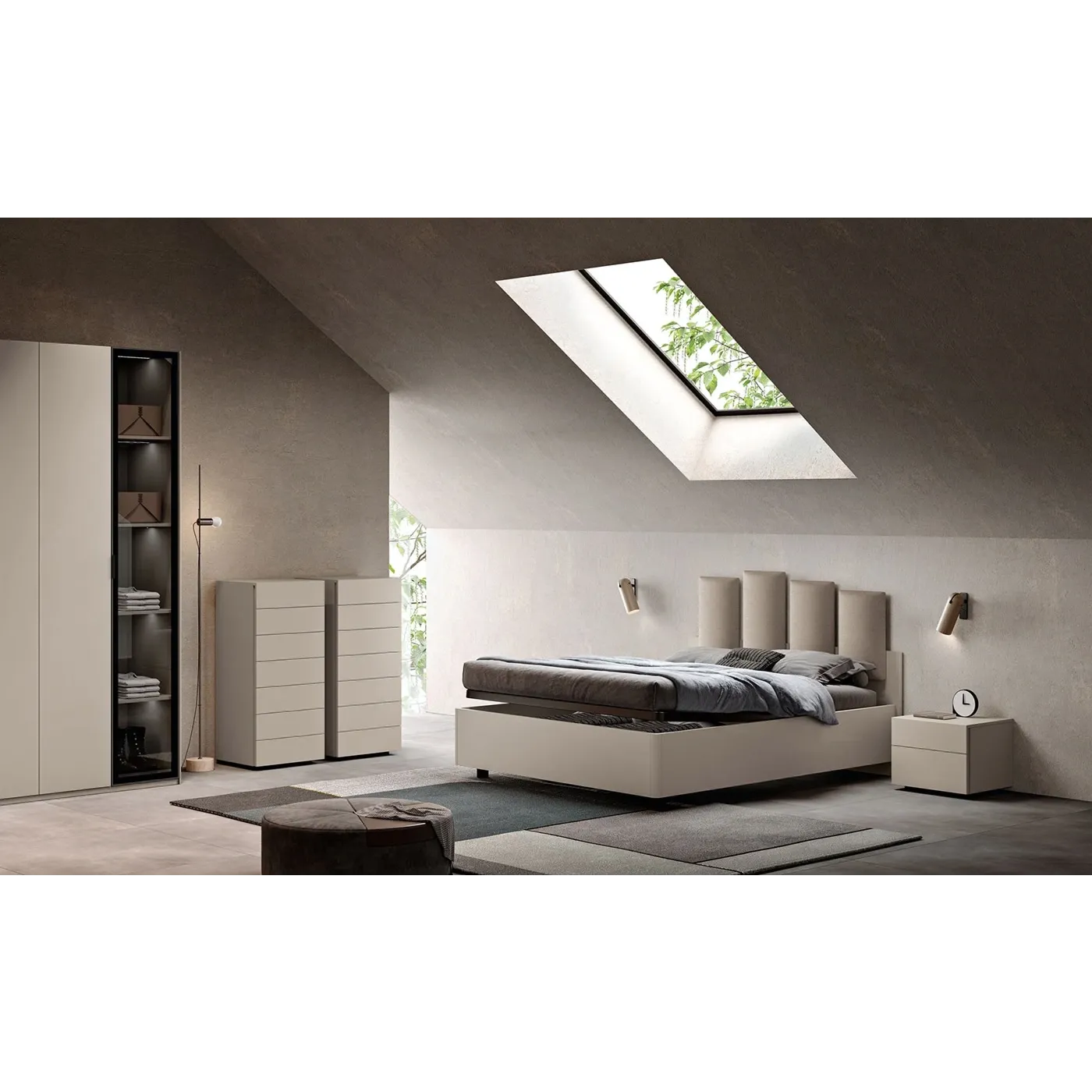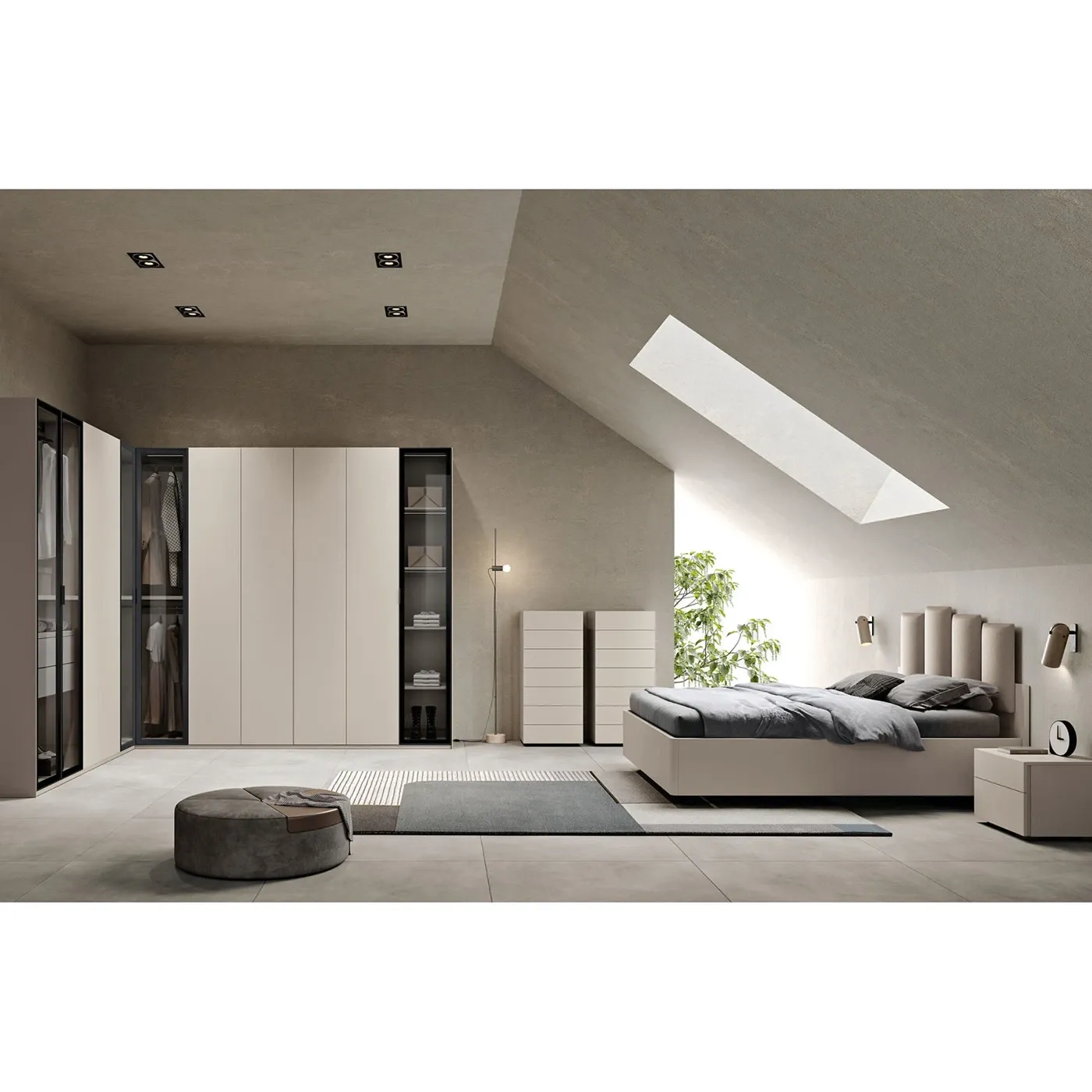 L'armadio in finitura Corda, accostata alla finitua Metal grey delle maniglie e delle cornici delle ante in vetro, danno un tocco di modernità alla camera da letto.