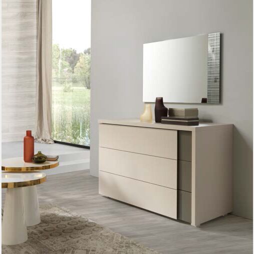Comò e comodini presentano rispettivamente 3 e 2 cassetti, dotati di chiusura ammortizzata di serie offrono la giusta capienza per avere un ambiente ben ordinato e pratico. Le finiture di armadio, comò e comodini sono Cachemire per scocca e frontali, mentre le maniglie sono proposte in Grigio londra. La possibilità di personalizzare scocca e frontali assicura una camera matrimoniale in perfetta armonia con i propri gusti ed il proprio modo di vivere la zona notte. Scopri le finiture materiche, nbilitate e decor disponibili!