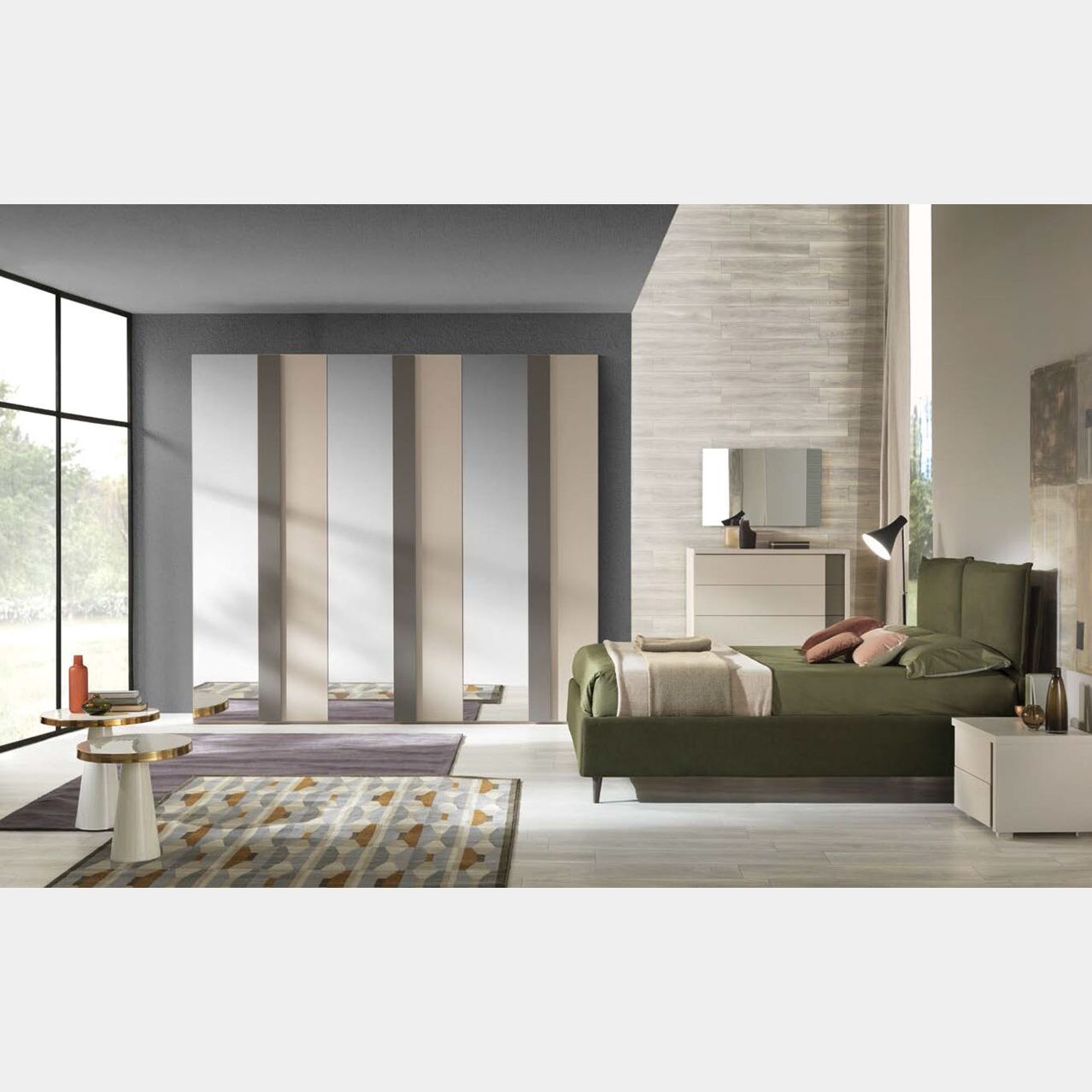 L'alternanza di finiture in Grigio londra e Cachemire crea un gioco di colori tale da consentire alla camera da letto di personalizzare l'ambiente, rendendolo unico. La camera è composta da un armadio a 6 ante battenti ed un set di comò e comodino, il letto è optional.