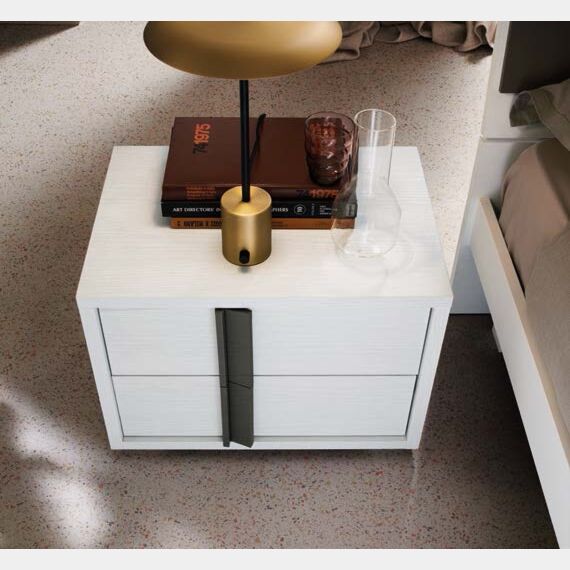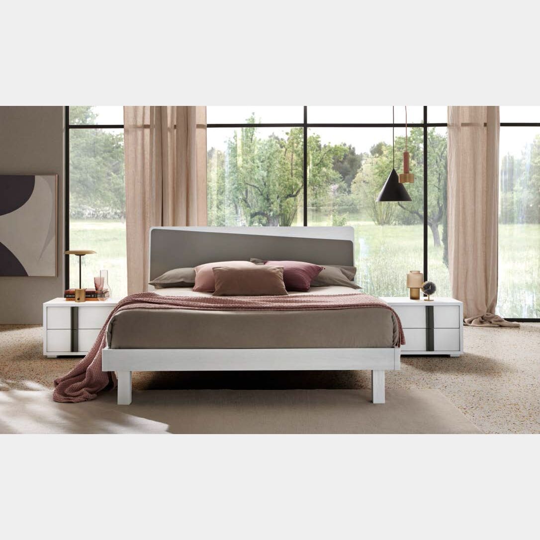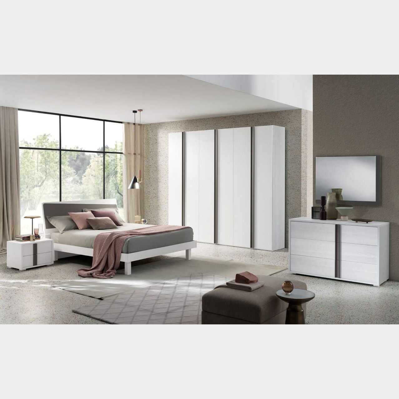 Il comò ed i due comodini presentano capienti cassetti il cui interno è trama madreperla, sono dotati di guide ammortizzate. Il letto matrimoniale, che supporta una rete da 160x190, presenta un pannello Grigio londra in testata che riprende la finitura delle maniglie di armadio, comò e comodini.