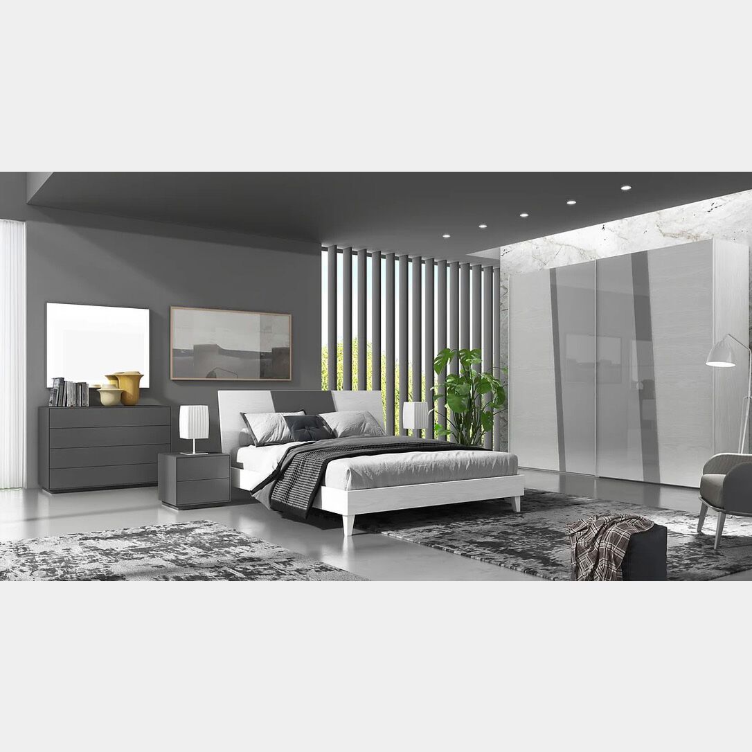 Si alternano le finiture in Frassino gesso e Grigio scuro. Caratterizzata dal design moderno e all'avanguardia, questa camera è il giusto compromesso tra stile e funzionalità.