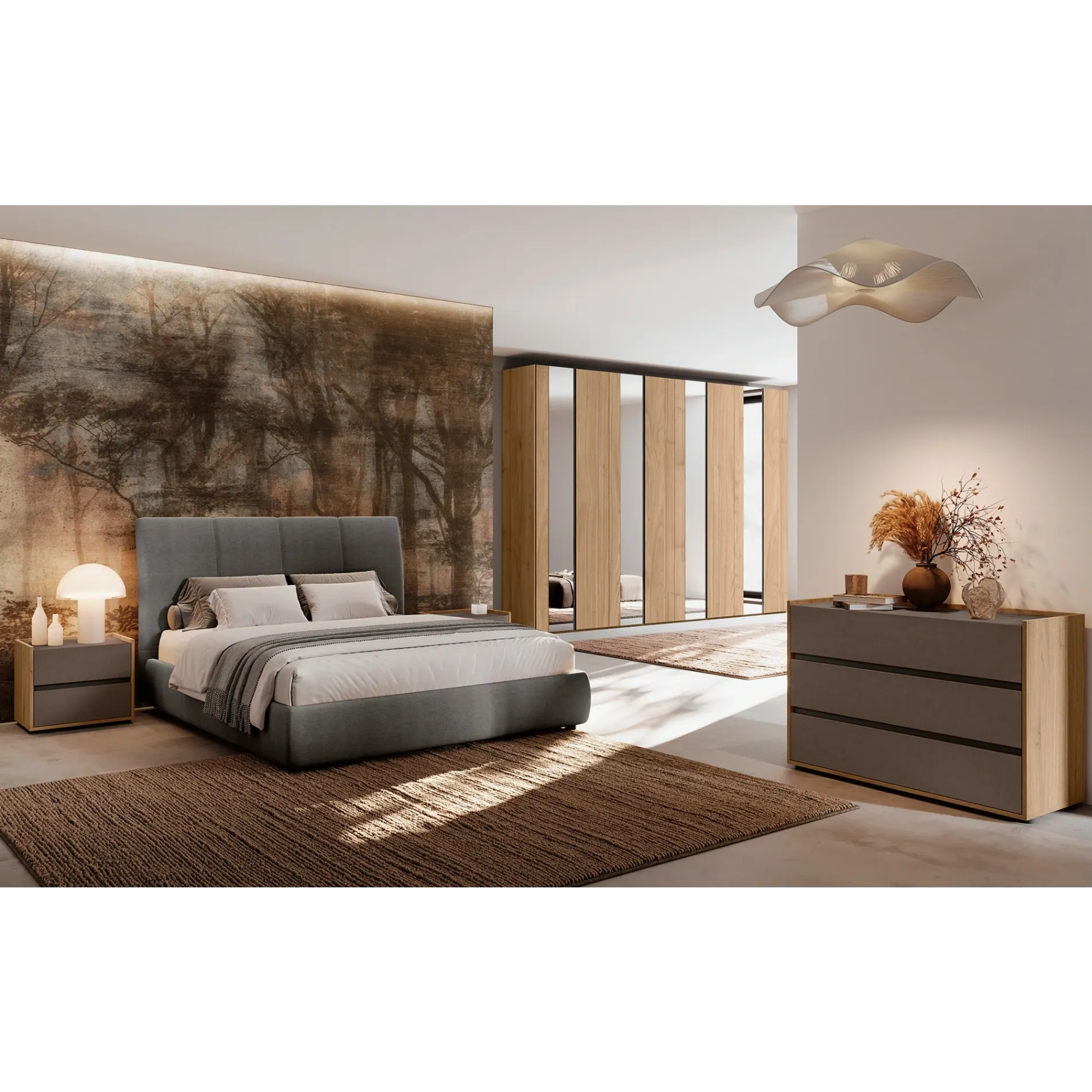 La camera da letto è composta da un armadio ad 8 ante, un letto matrimoniale contenitore e dalla coppia di comodini, nelle finiture Noce biondo, Bronzo e tessuto Nabuk Antracite. Scopri tutta la collezione Element!