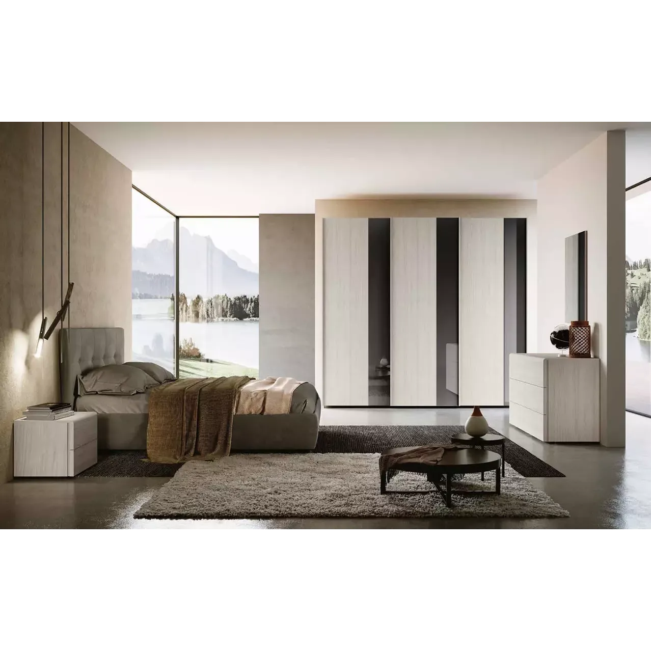La camera è composta da un armadio a tre ante scorrevoli con inseriti in specchio fumè, un pratico letto imbottito in color Antracite con box contenitore, perfetto per stivare coperte, cuscini o biancheria da letto, una coppia di comodini a due cassetti, il comò a tre cassetti e la specchiera rettangolare.