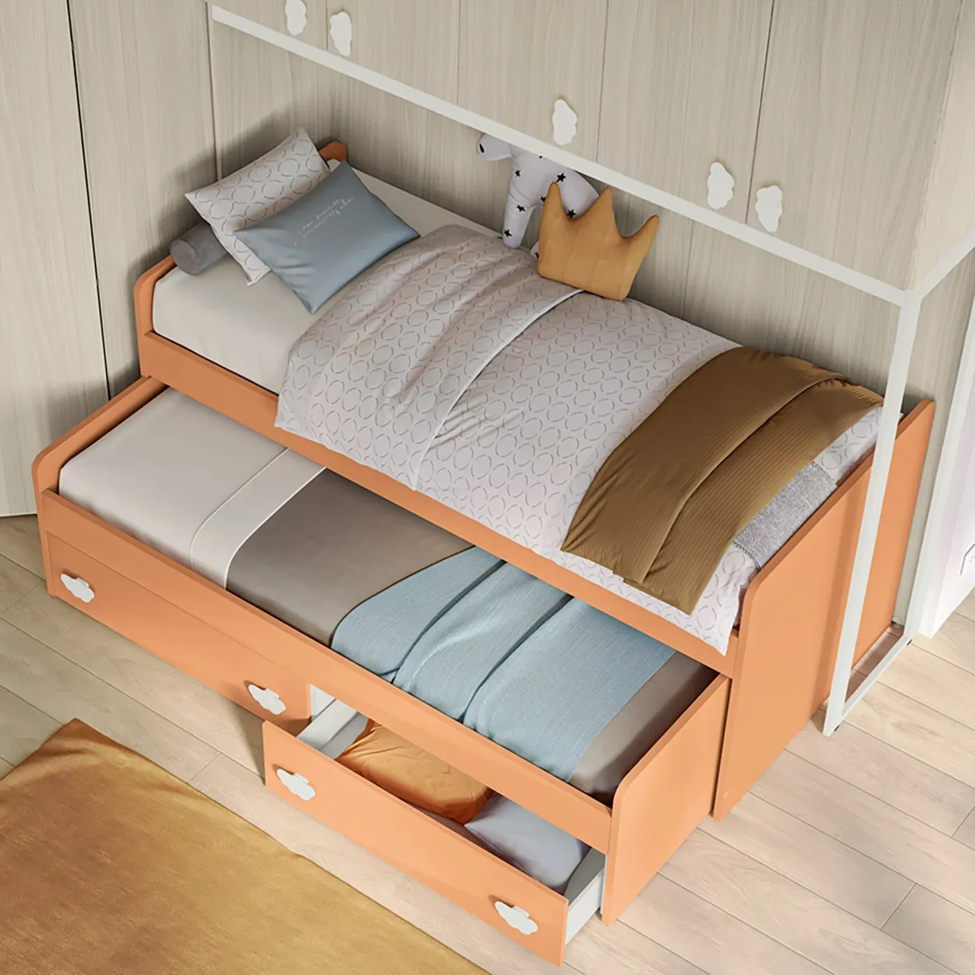 Insieme alla scrivania c'è un divano letto è dotato di 2 cassetti estraibili, posizionati nella parte inferiore della struttura. I cassetti offrono spazio aggiuntivo per riporre biancheria da letto, giocattoli o altri oggetti.