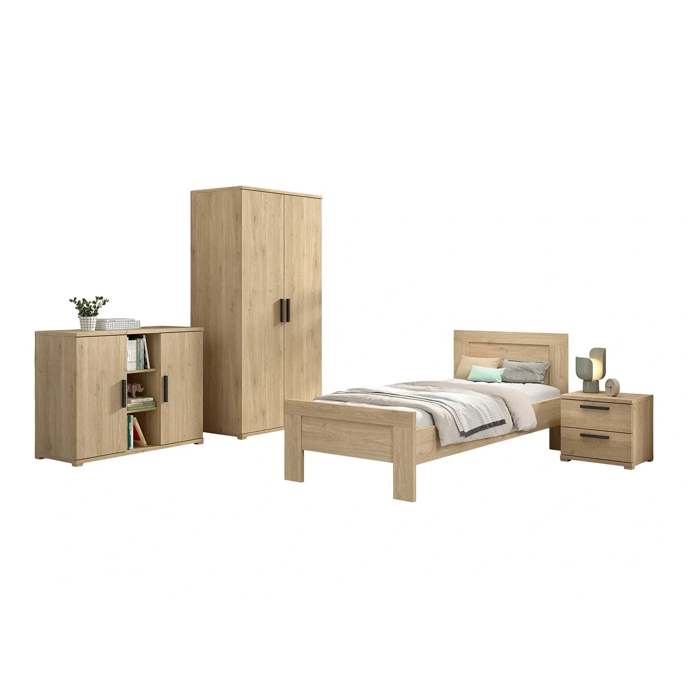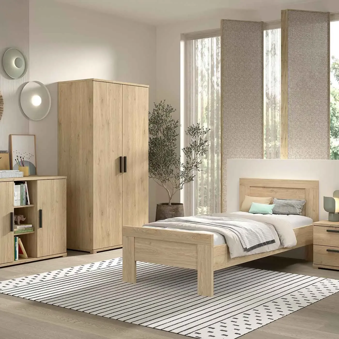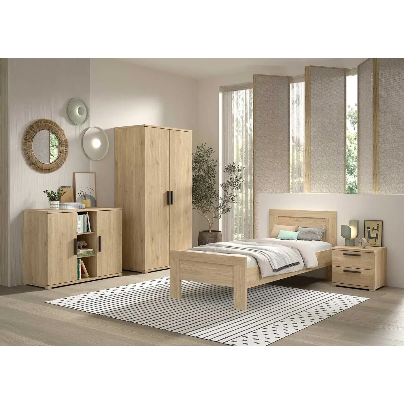 La rete a doghe non è inclusa, ma la struttura del letto garantisce il massimo della comodità. Il comodino ha 2 ampi cassetti per riporre gli oggetti personali o qualsiasi altro si voglia. L'armadio a 2 ante offre ampio spazio di archiviazione e include 2 ripiani e un'asta appendiabiti. Infine la camera è dotata di una spaziosa cassettiera include 2 ante, ciascuna con un ripiano dentro, e 2 ripiani a giorno al centro.