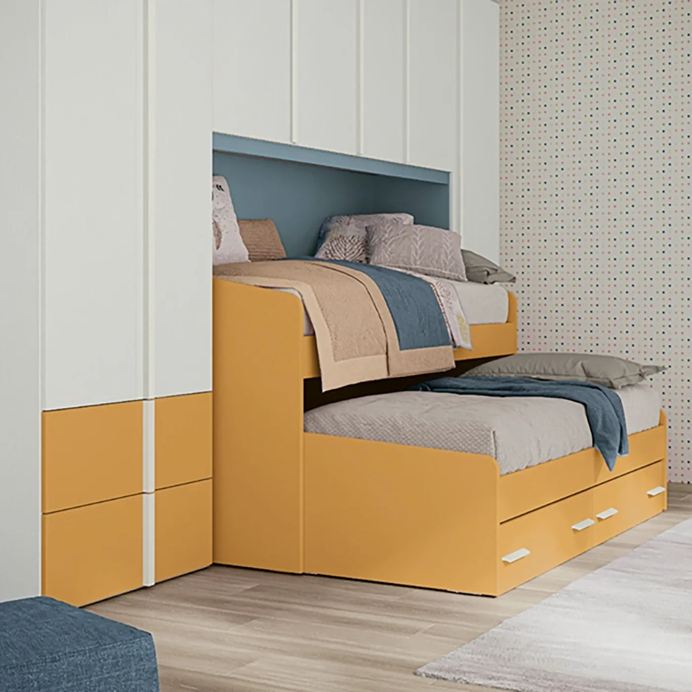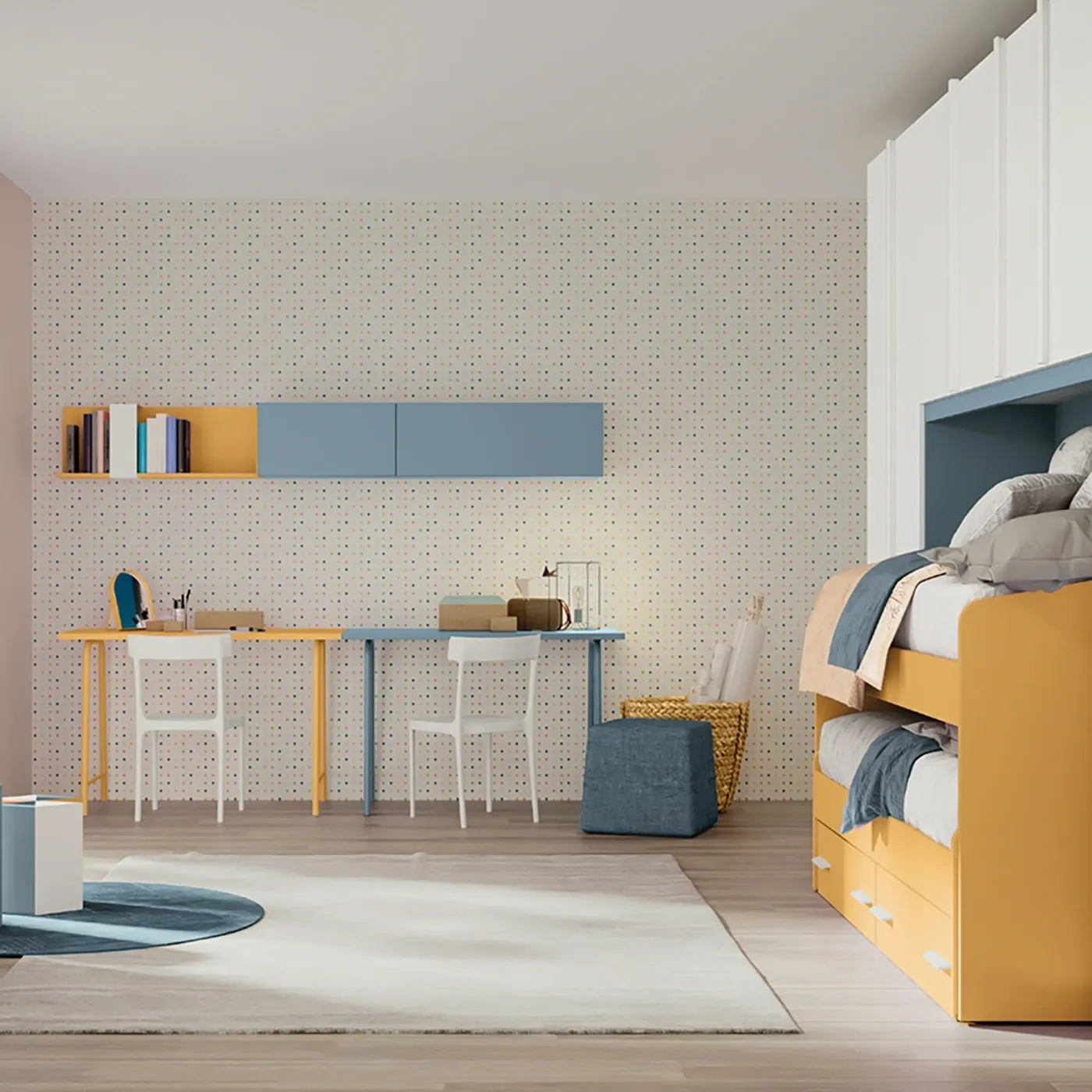 Cameretta per bambini e ragazzi in tripla finitura Cadaques, Miele e Rovere bianco, provvista di doppia zona studio, armadio a ponte e letto con secondo estraibile.