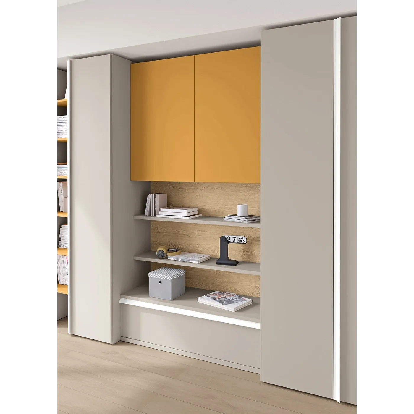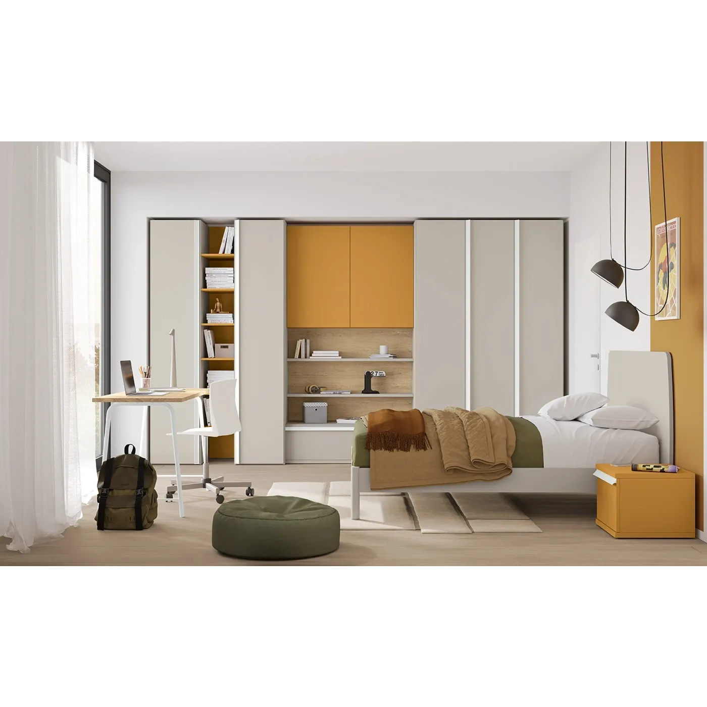 Cameretta per ragazzi provvista di scrivania, letto singolo e armadio a parete a 5 ante con pensili a terra, sospesi e libreria. Il tutto in finitura Miele e Grigio dorian.
