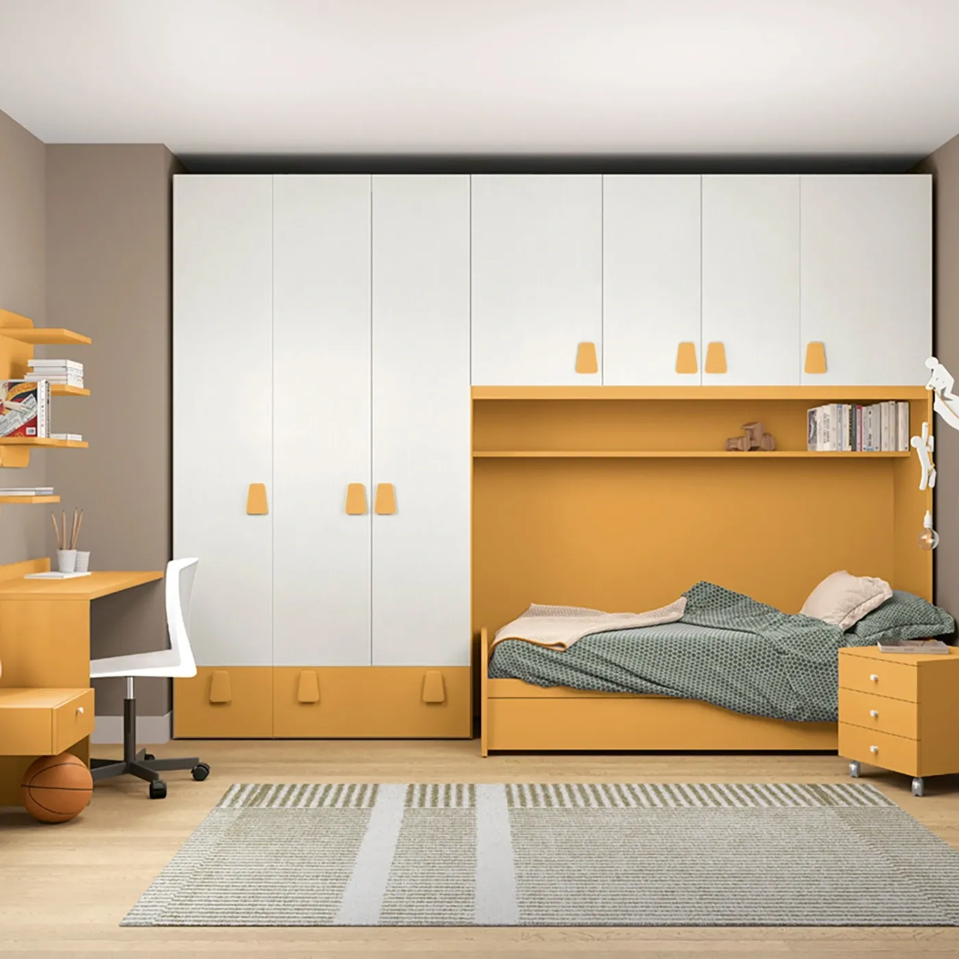 Cameretta per bambini o ragazzi della collezione Aquila. Si compone di un armadio a ponte a 7 ante modulabile, di un letto con secondo estraibile e di una scrivania con cassetto sospeso.