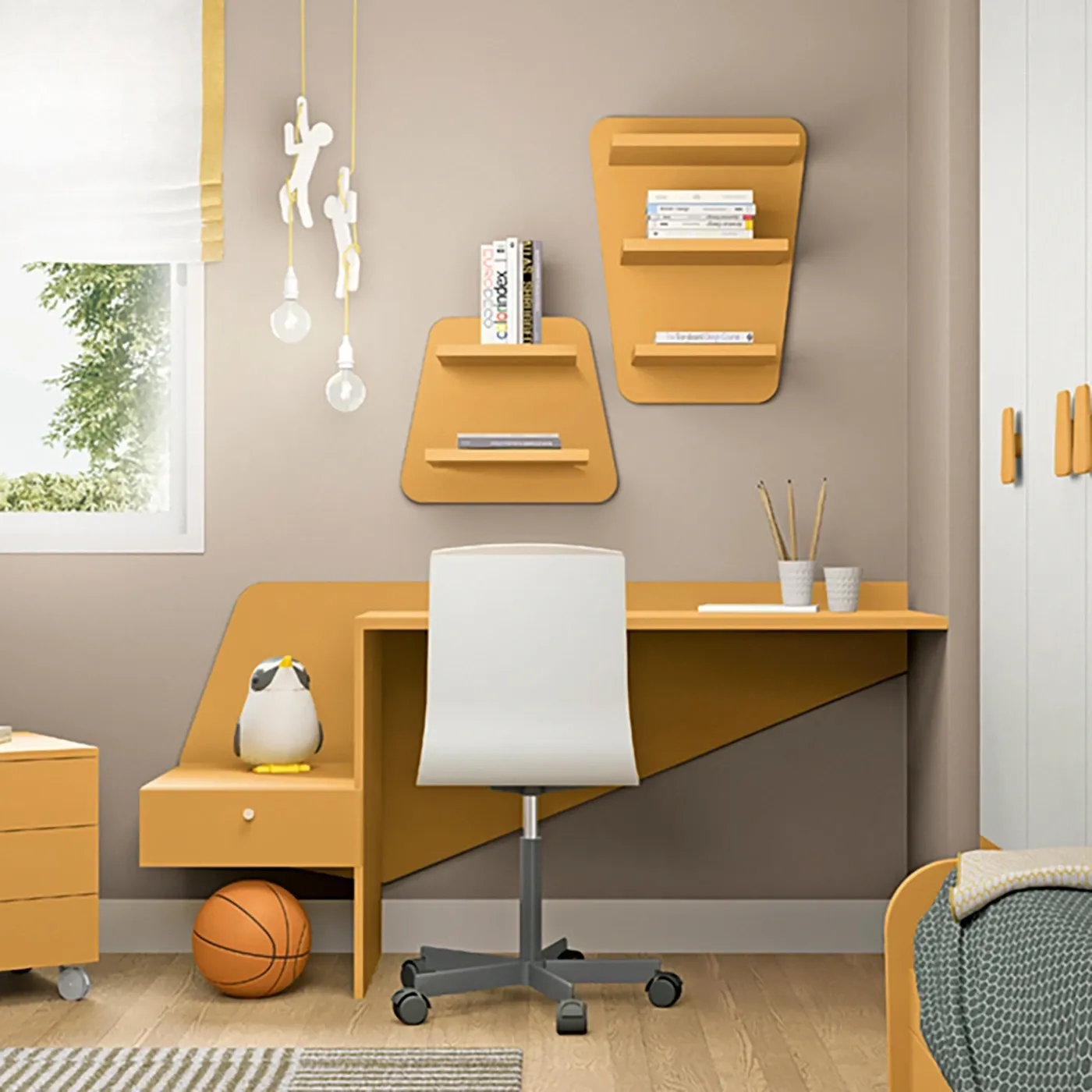 Infine, vi è il letto, in finitura Miele, il quale dona alla cameretta grinta e carattere grazie ai suoi colori accesi. E' possibile anche personalizzarne la finitura rendendolo più adatto alle proprire esigenze e gusti personali.