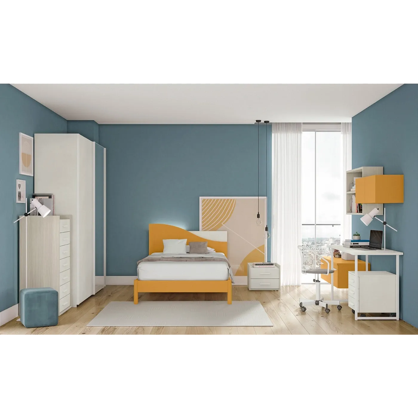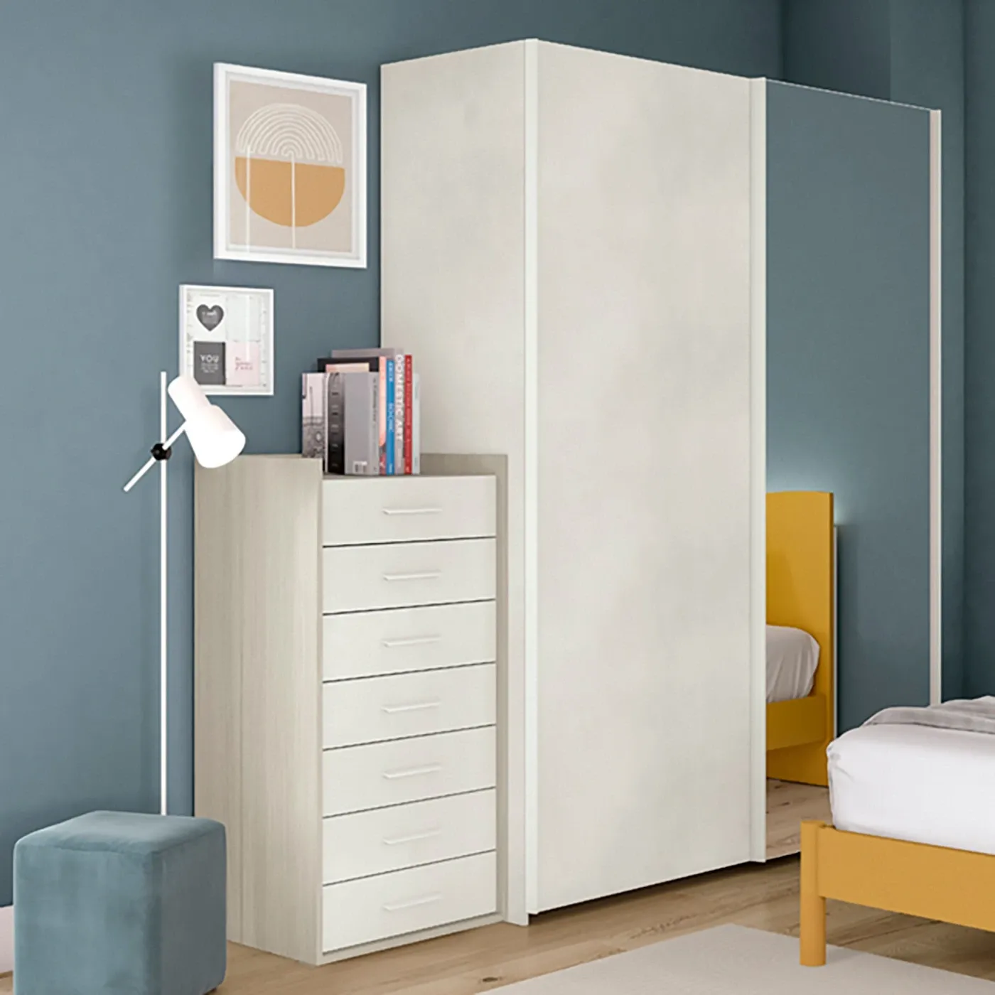 Camera per ragazzi con settimino e armadio con anta a specchio, Miele e Cemento artico