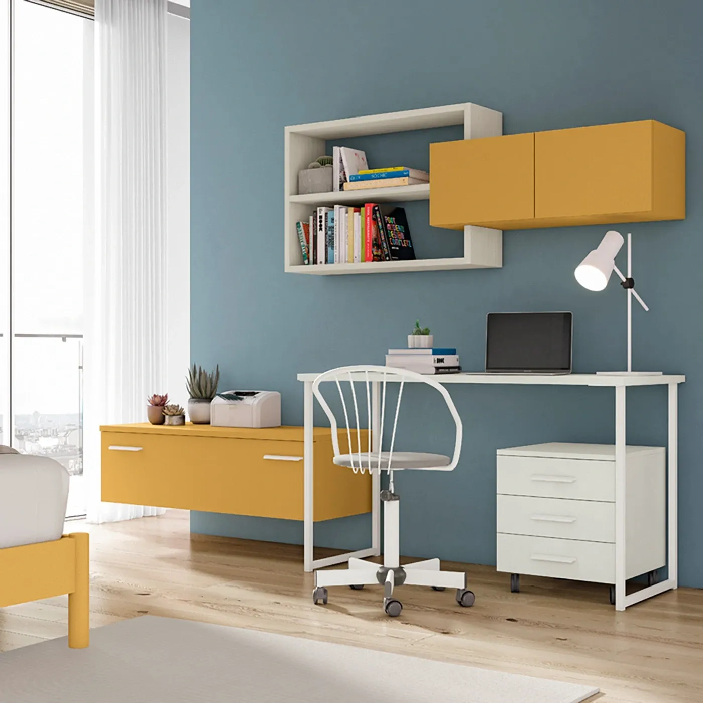 Camera da letto per bambini e ragazzi della Collezione Aquila, provvista di zona studio accessoriata, letto ad una piazza e mezza con testata sagomata e armadio scorrevole con anta a specchio.