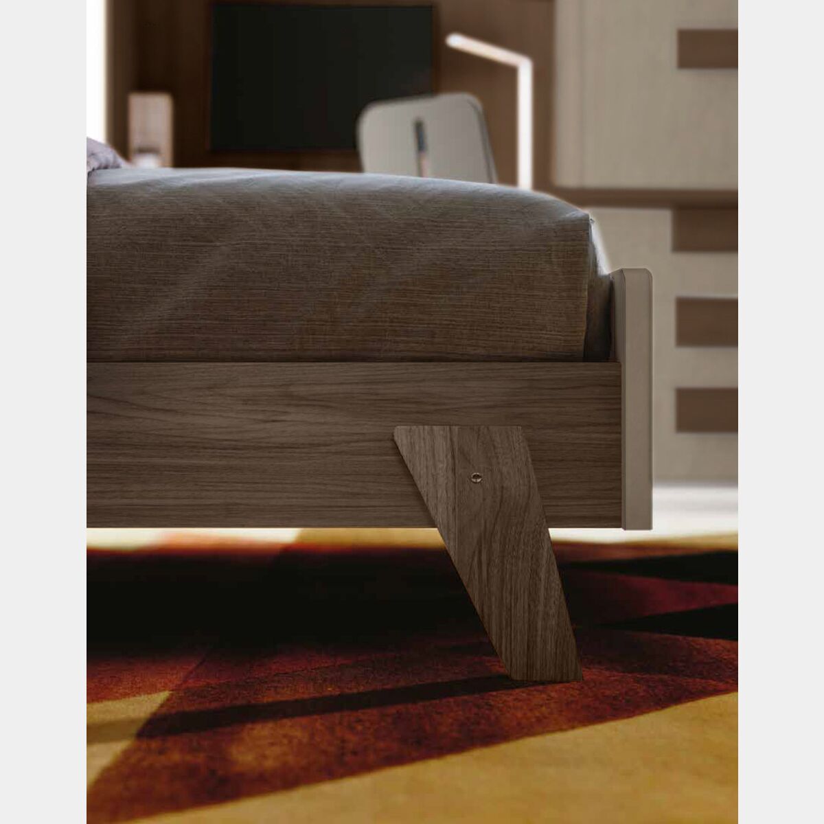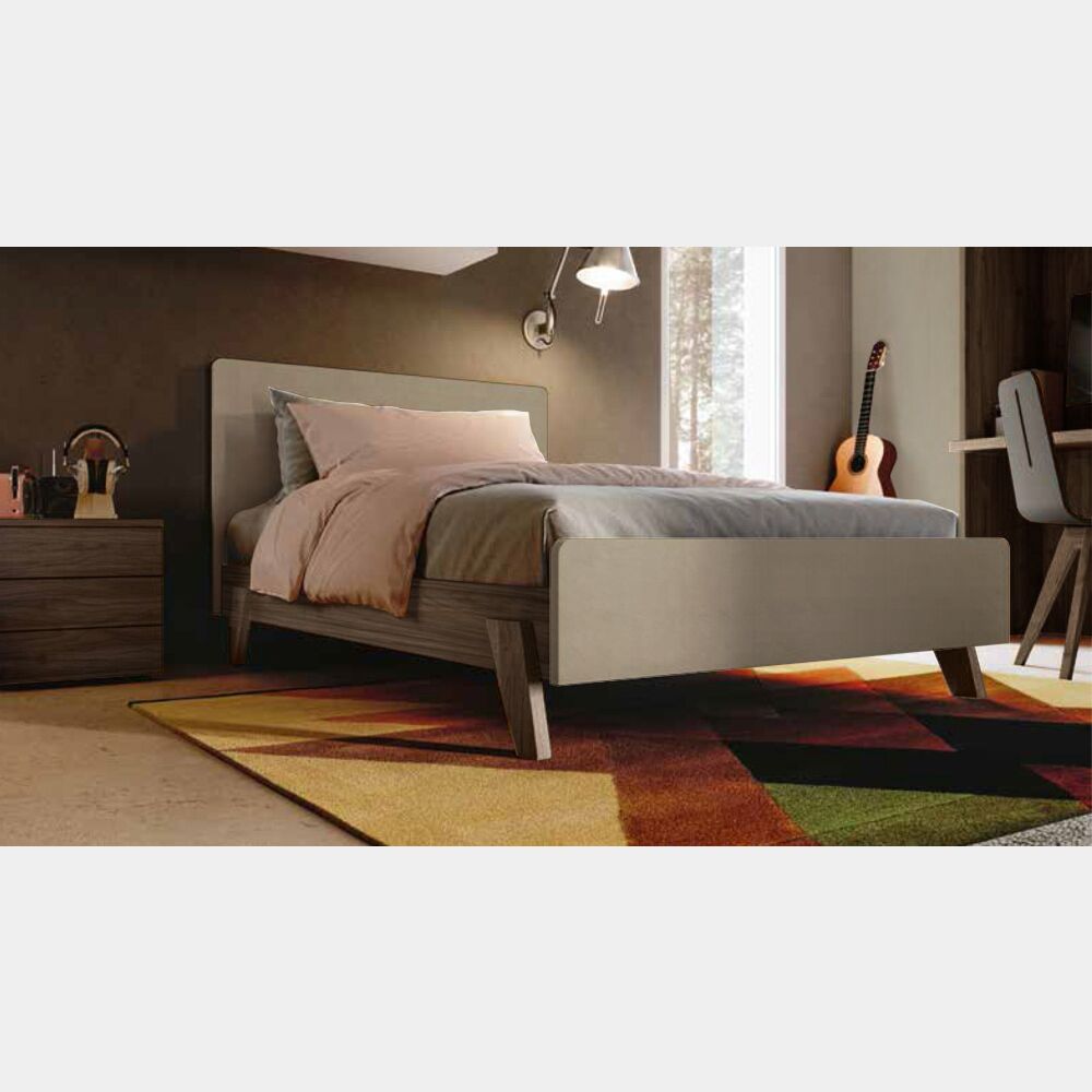 Il letto ad una piazza e mezza presenta un design semplice ma non banale: i particolari piedini e l'accostamento di due finiture lo personalizzano rendendolo moderno e originale.