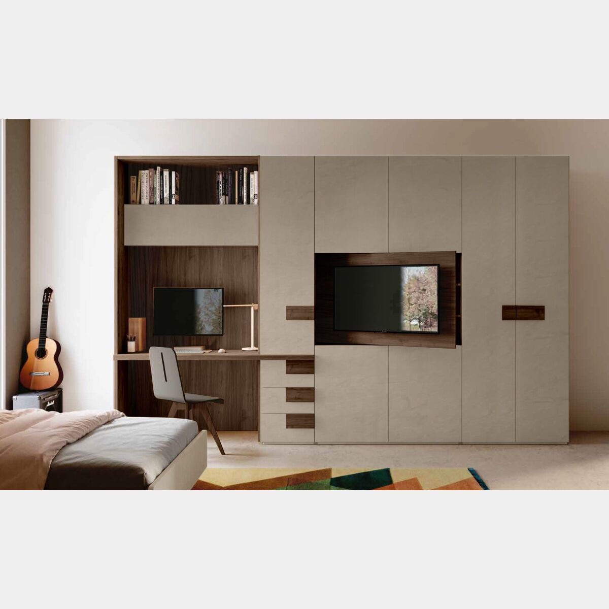 L'armadio è dotato di un vano tv orientabile per assicurare una corretta visione della televisione in tutte le direzioni, posteriormente vi è una piccola libreria composta da 2 ripiani. Il modulo collegato alla zona studio prevede un'anta e 3 cassetti.