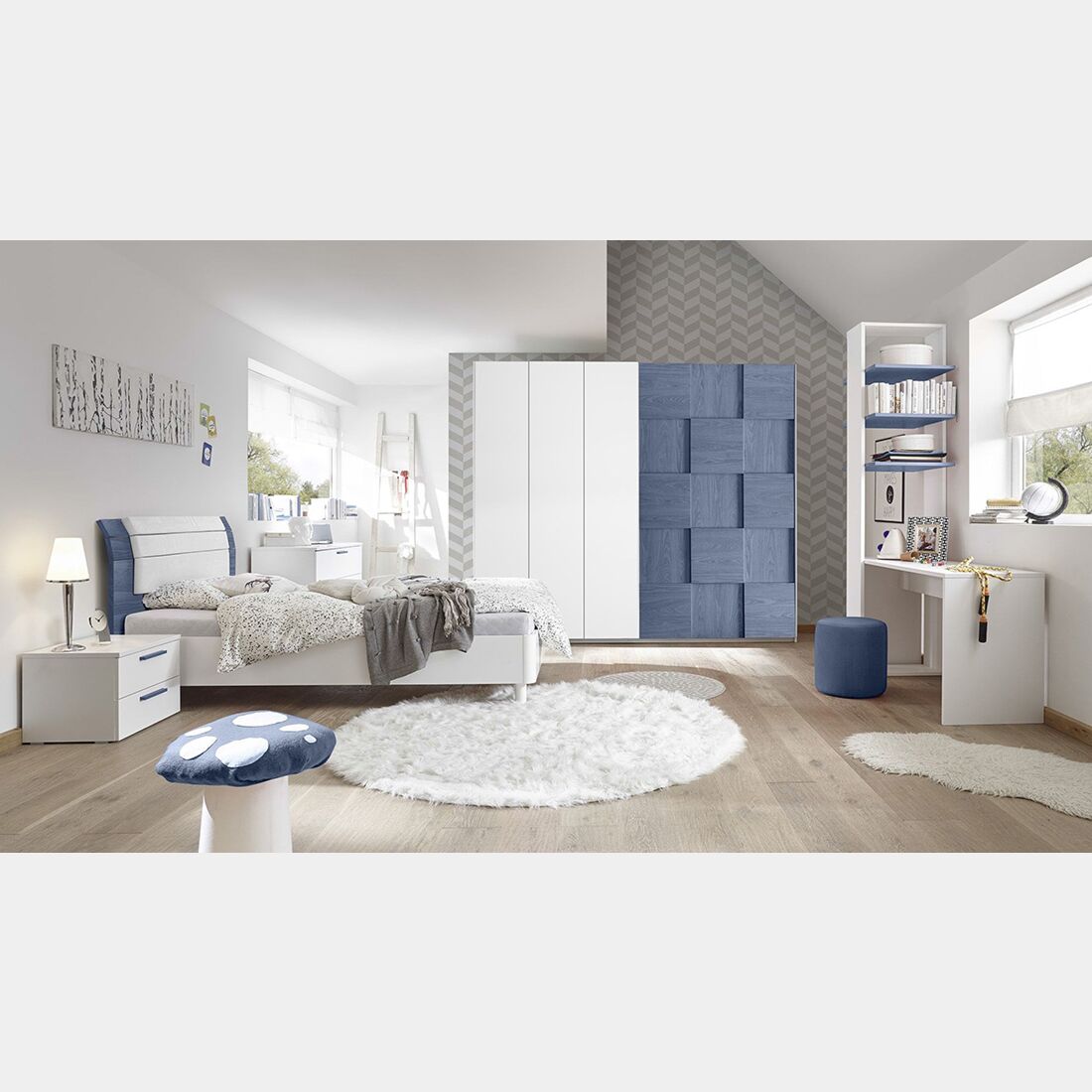 Camera disponibile in diversi colori:bianco opaco, bianco opaco / blu, bianco opaco / grigio.