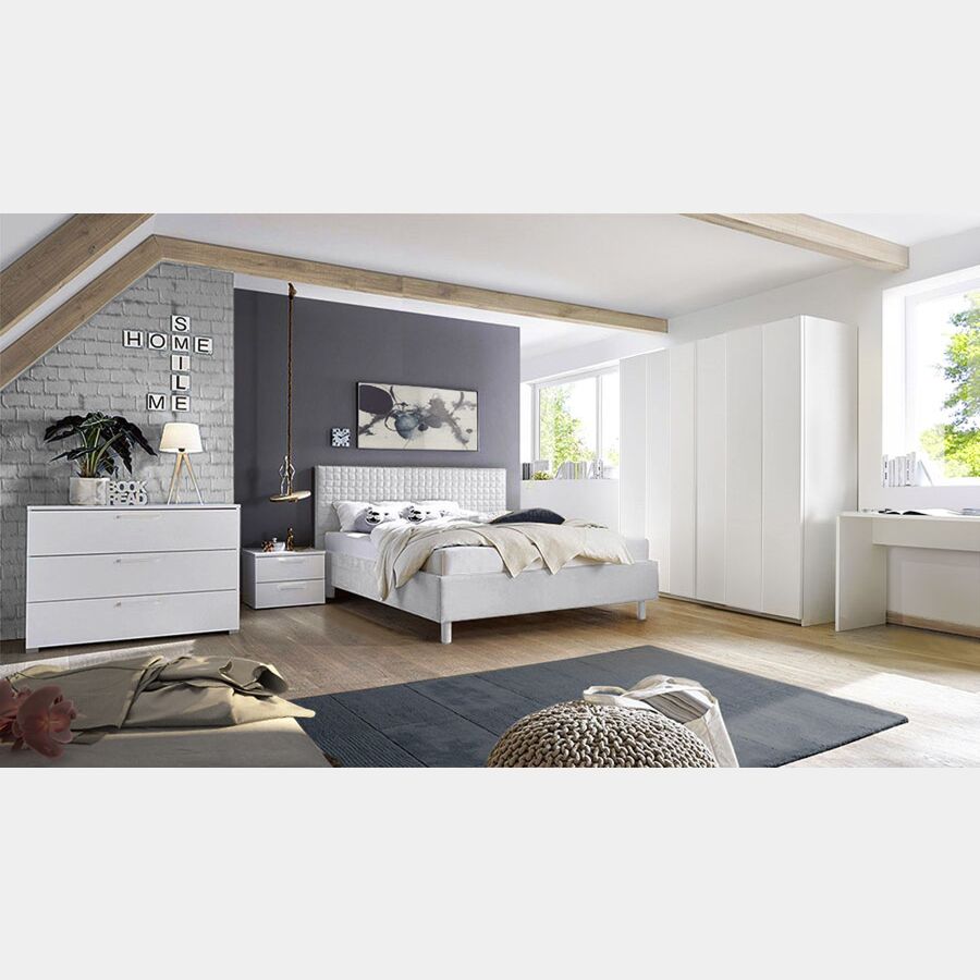 Camera matrimoniale moderna composta da letto matrimoniale con testiera in tessuto imbottito color Bianco, armadio scorrevole a 2 ante e coppia di comodini a 2 cassetti. La camera da letto matrimoniale è un prodotto made in italy di alta qualità ed è certificato FSC. La vernice utilizzata sono atossiche classificazione E1.