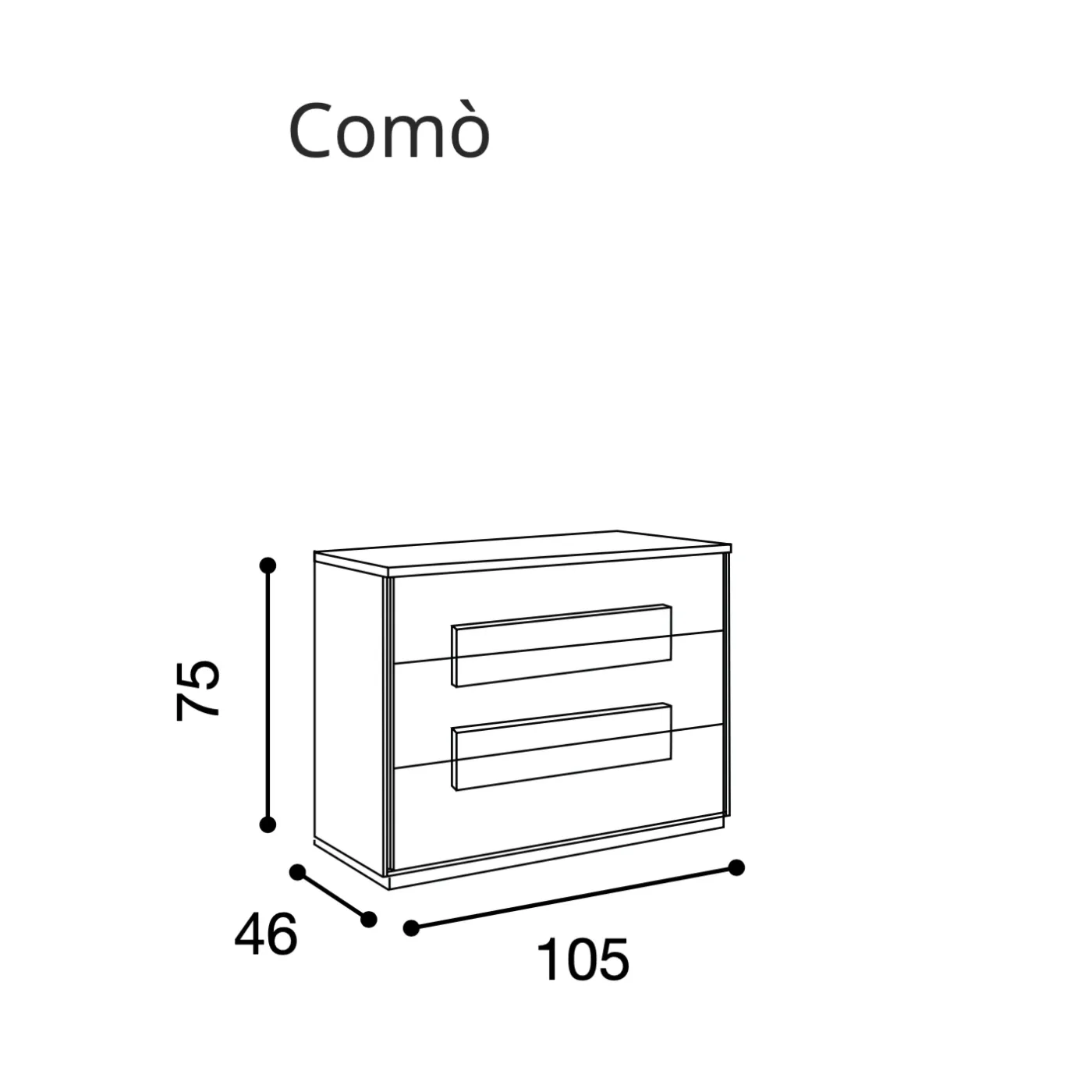 I comodini e comò sono formati rispettivamente da due e tre cassetti, dettaglio che emerge sono le particolari maniglie orizzontali che completano i frontali.
