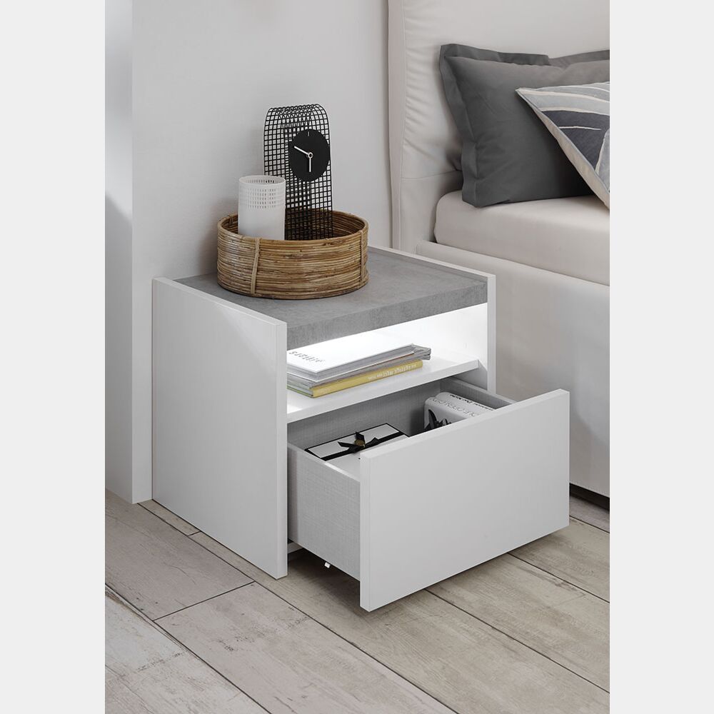 Coppia Comodini 1 cassetto con vano a giorno con piano Beton e finitura scocca bianco opaco. Il comodino ha la struttura e cassetto con uno spessore di 22mm. Le guide del cassetto sono ammortizzate. Ai comodini è possibile aggiungere la luce LED creando un mondo di effetti.