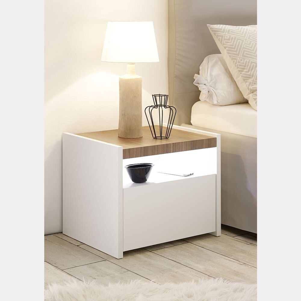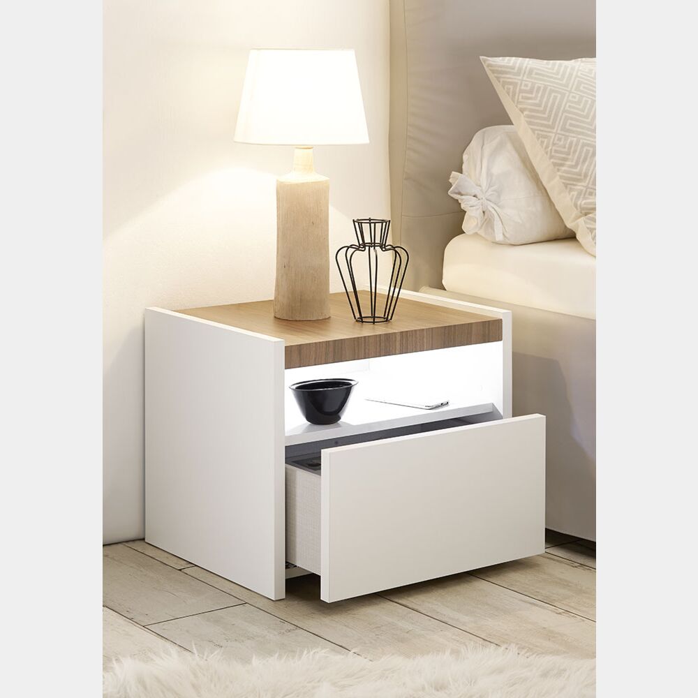 Coppia Comodini 1 cassetto con vano a giorno con piano Noce Stelvio e finitura scocca bianco opaco. Il comodino ha la struttura e cassetto con uno spessore di 22mm. Le guide del cassetto sono ammortizzate. Ai comodini è possibile aggiungere la luce LED creando un mondo di effetti.