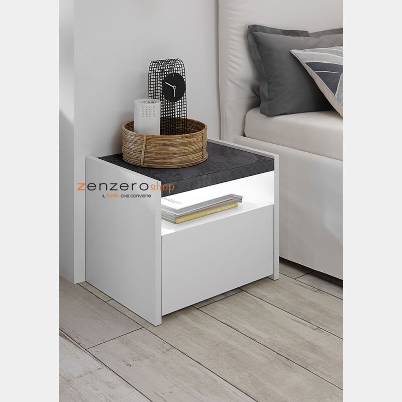 Coppia Comodini, 1 cassetto con vano a giorno con piano Ossido e finitura scocca bianco opaco. Le guide del cassetto sono ammortizzate. Ai comodini è possibile aggiungere la luce LED creando un mondo di effetti.