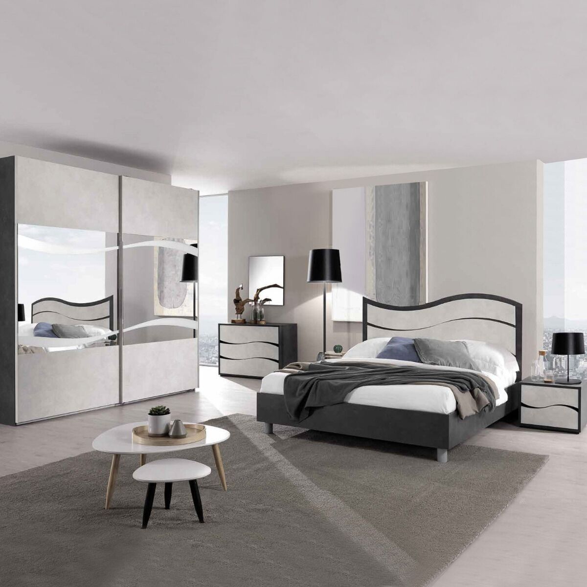 La camera è composta da un armadio a 2 ante scorrevoli, un letto matrimoniale e la coppia di comodini. E' possibile completare la composizione richiedendo il comò a tre cassetti e lo specchio rettangolare, tramite apposito configuratore.