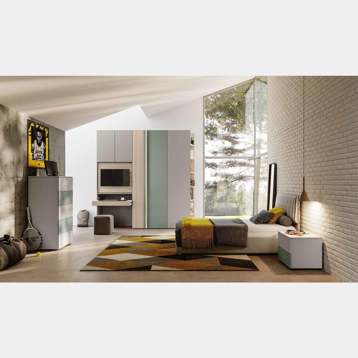 Il rifugio di bambini e ragazzi è la cameretta, luogo che diventa ispirazione per crescere e giocare in totale spensieratezza. La cameretta proposta presenta 3 finiture: una materica e lisce, pastello. L'unione di queste tinte genera calore e fascino, per questo la cameretta diventa una perfetta soluzione d'arredo sia per ragazzi che ragazze. Il Grigio seta si alterna all'Agave donando armonia e carattere all'ambiente. A completare la composizione è l'Olmo natura, finitura materica che riporta l'eleganza senza tempo del legno.