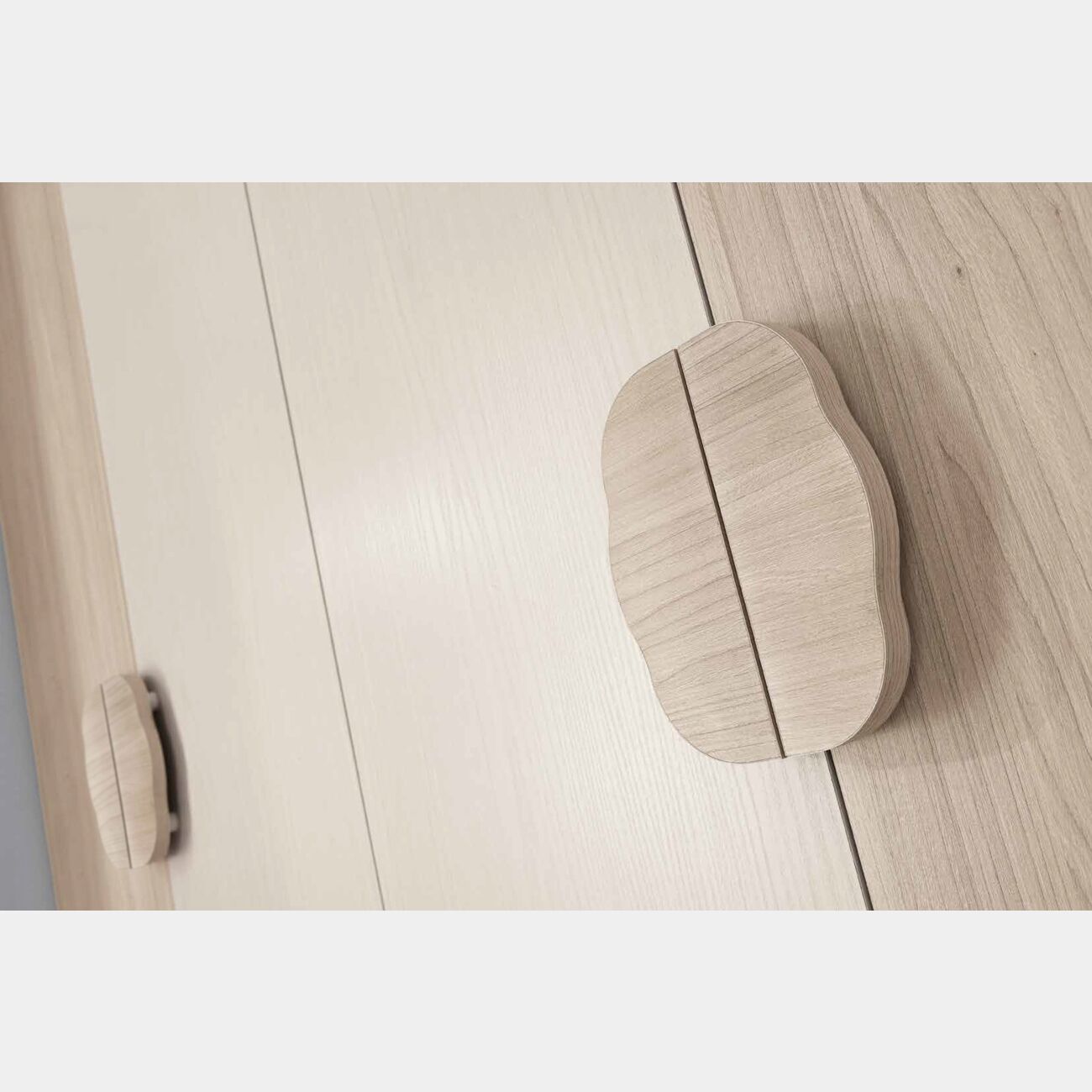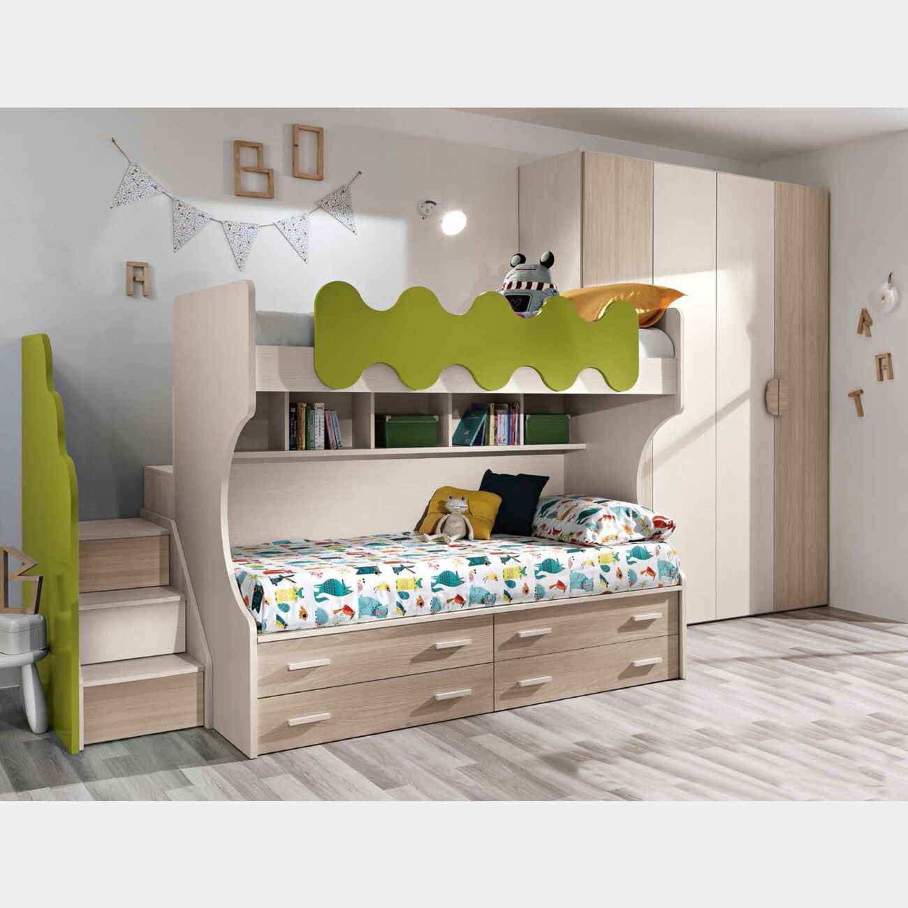 Il letto a castello è in finiturà olmo e betulla, con parabordo (optional) verde acido. La finitura del letto può essere cambiata in due diversi punti del letto, creando un bel gioco di colori.