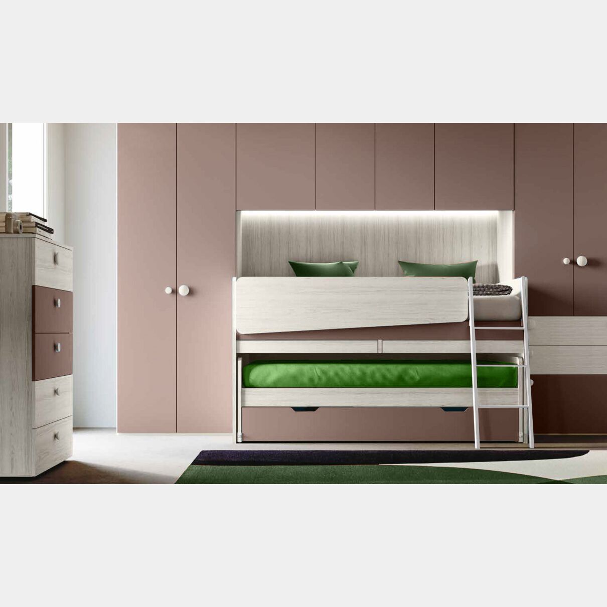 Le finiture proposte per la cameretta a ponte sono Bianco altea e Spatolato bronzo, finiture che entrano in contrasto per assicurare una soluzione di arredo di impatto e caratteristica.