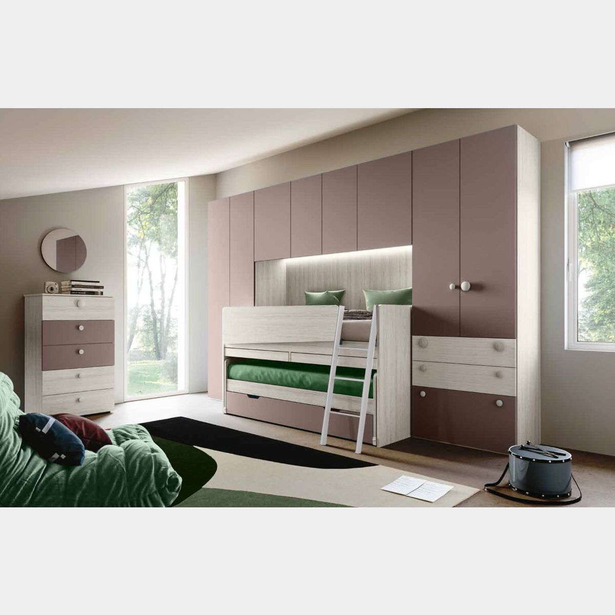 La cameretta è composta da un armadio a ponte con 4 ante battenti collegato a 2 moduli da 90: quello di sinistra presenta 2 ante mentre quello di dentra è formato da 2 ante, 2 cassetti ed un cestone.