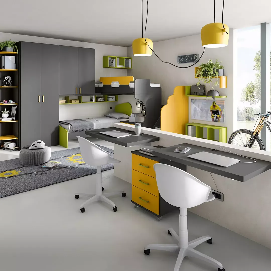 La cameretta a ponte presenta un letto superiore con passerella e scaletta cassettoni, a cui è possibile aggiungere il corrimano, un modulo a due ante a ponte, un elemento a due ante ed una libreria terminale.