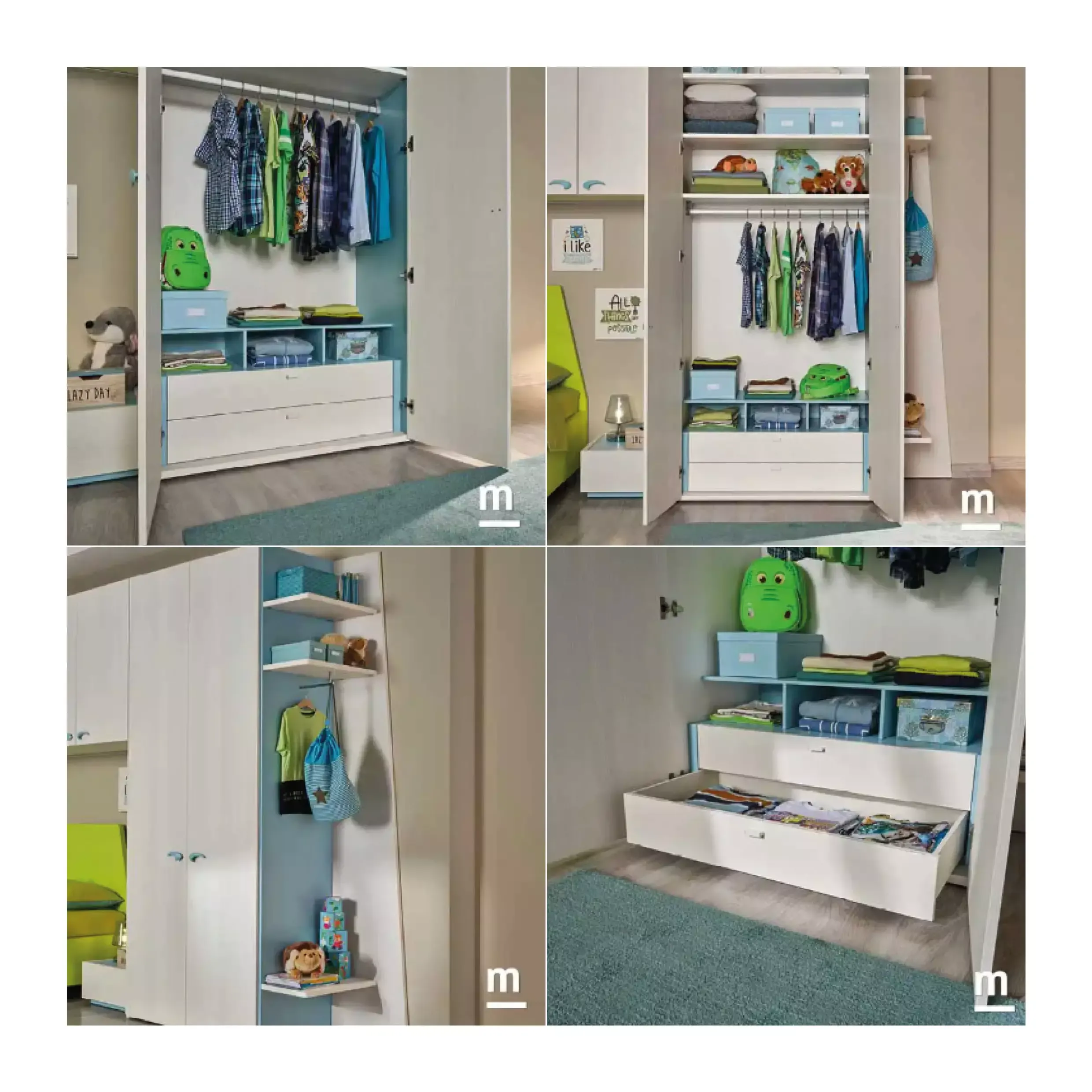 Un grande armadio con moduli sospesi e termiale caratterizza la cameretta, offrendo capienza e praticità. L'allestimento base prevede un ripiano e due tubi appendiabiti per il modulo a 2 ante, mentre in quelli sospesi vi è un tubo appendiabiti.
