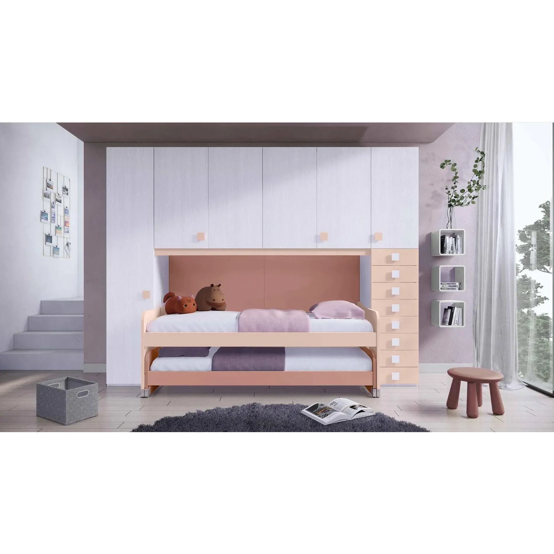 Moderna e funzionale la cameretta offre tutta la comodità necessaria per riposare al meglio, offrendo al contempo un'ampia capienza per indumenti, coperte, cuscini e tutti quegli oggetti utilizzati in camera da letto. La soluzione a ponte prevede un modulo con anta laterale, un modulo a ponte con ante ad apertura a libro, un modulo laterale con anta e 8 cassetti e un divano letto con secondo letto estraibile.