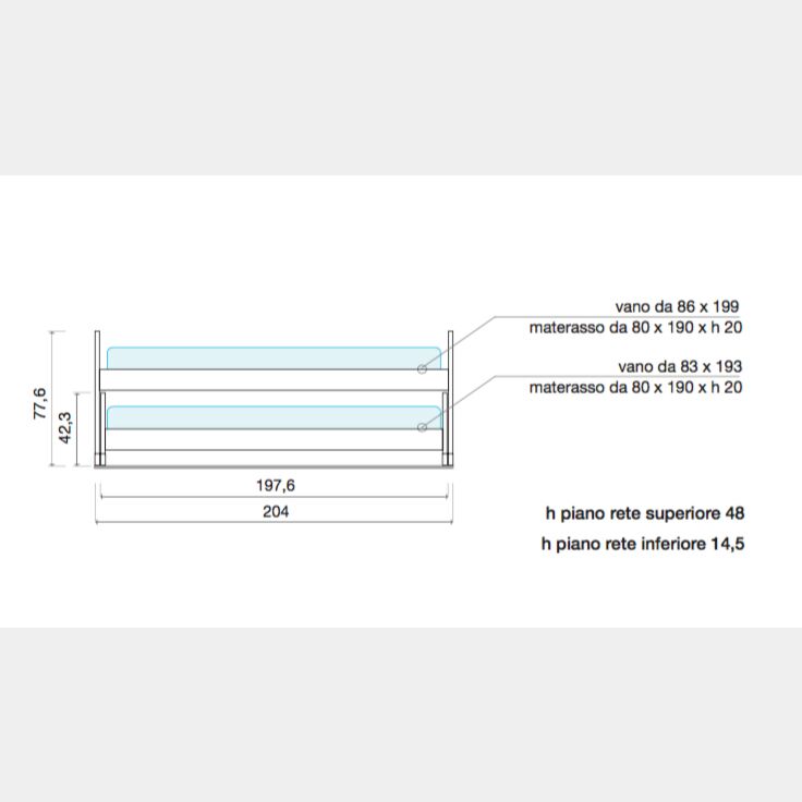 • Rete: telaio in acciaio 40x30 mm verniciato a polveri epossidiche atossiche, doghe in multistrato di betulla, supporti anti cigolio. Nel letto inferiore è possibile inserire un materasso H.max 20 cm. Dimensioni rete superiore 86x199, dimensioni rete inferiore: 83x193 cm.