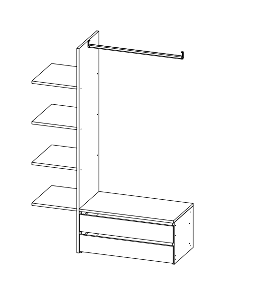 L'allestimento standard prevede un ripiano e due tubi appendiabiti per vano, è possibile richiedere tramite checkbox ulteriori ripiani, scaffalatura con cassettiera e l'illuminazione.