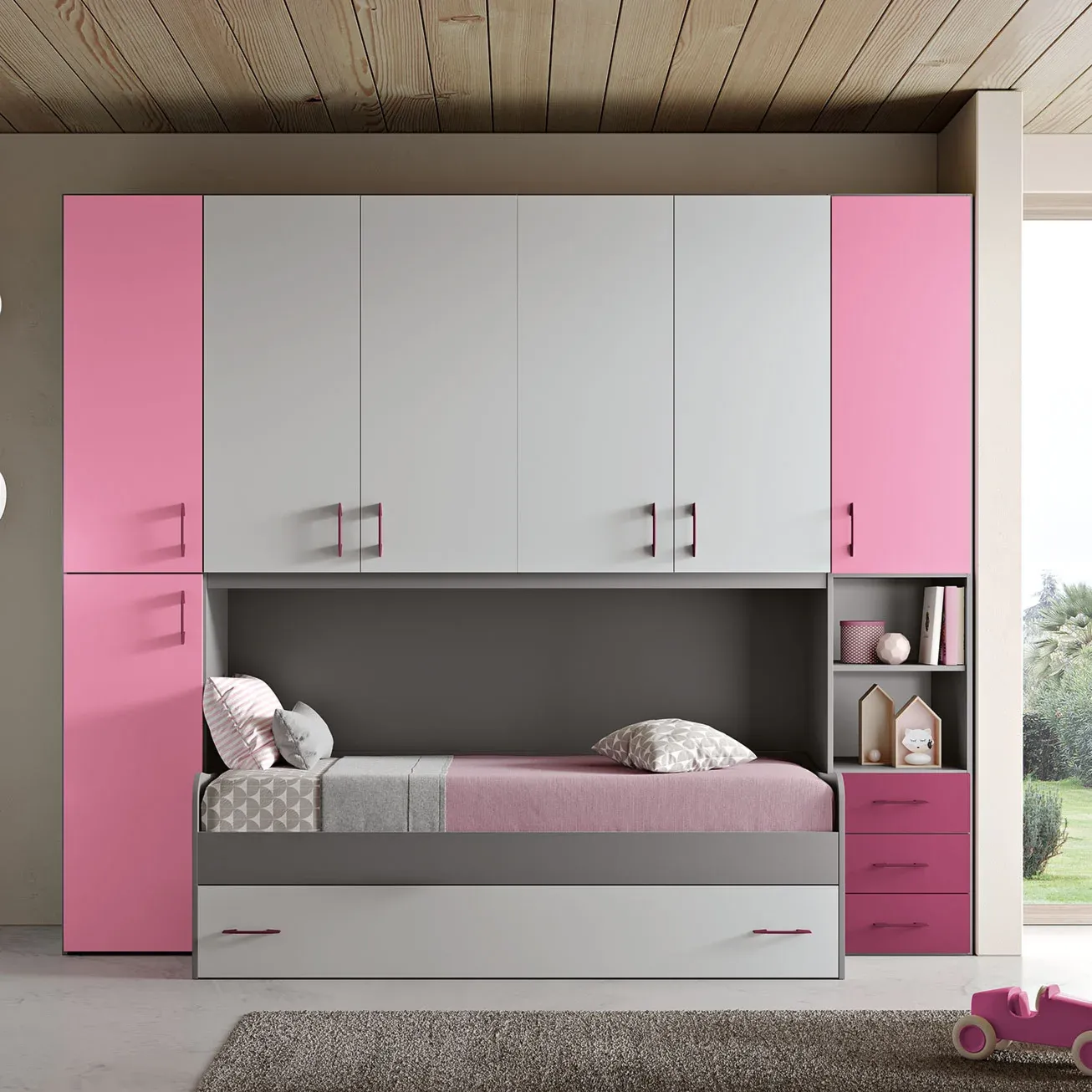 Cameretta bambina a ponte Miriam, finitura Grigio scuro, chiaro, Ortensia, Cranberry