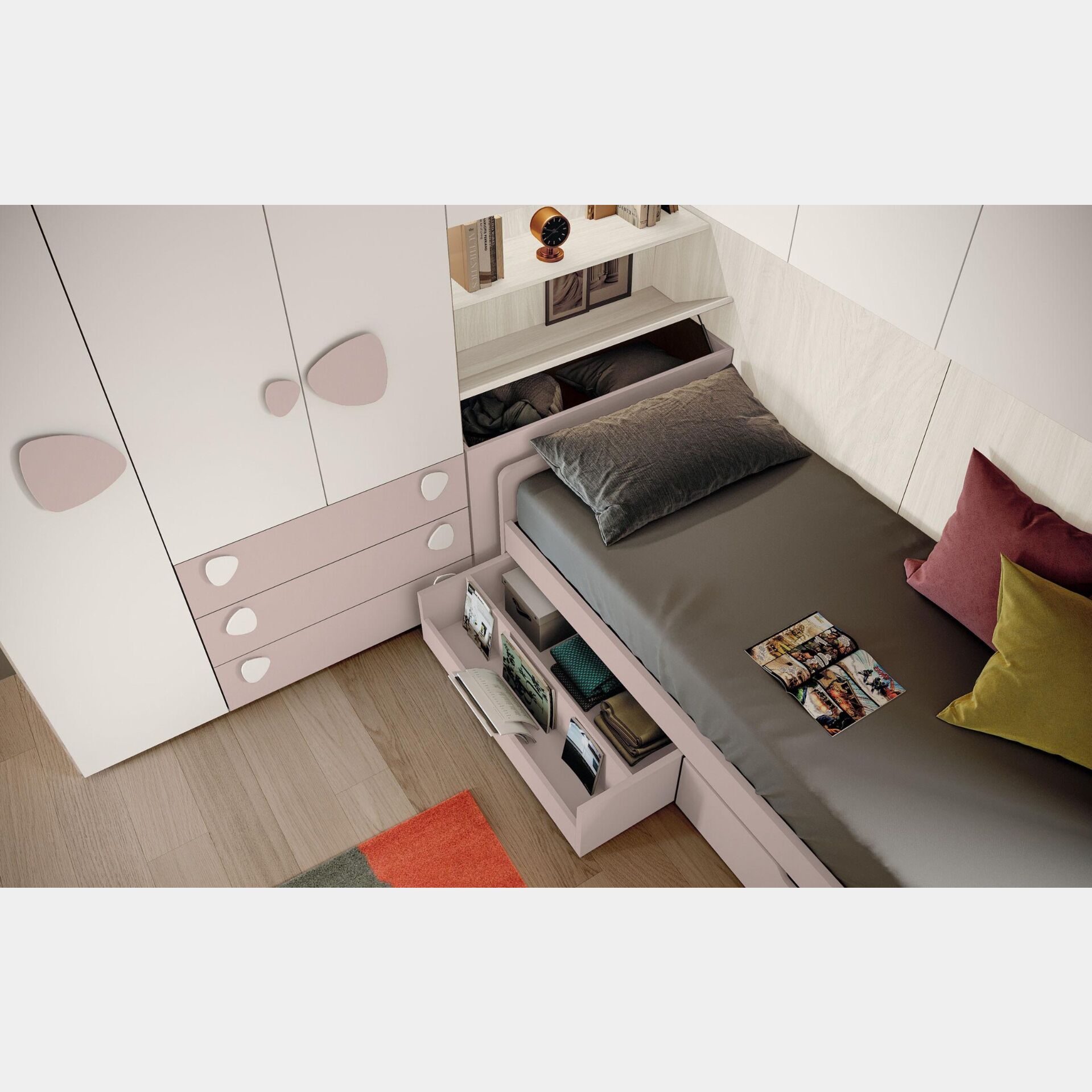 Anche il letto fa la sua parte; i 2 cassettoni posti nella parte inferiore assicurano un ulteriore piano i appoggio per libri, coperte e cuscini.