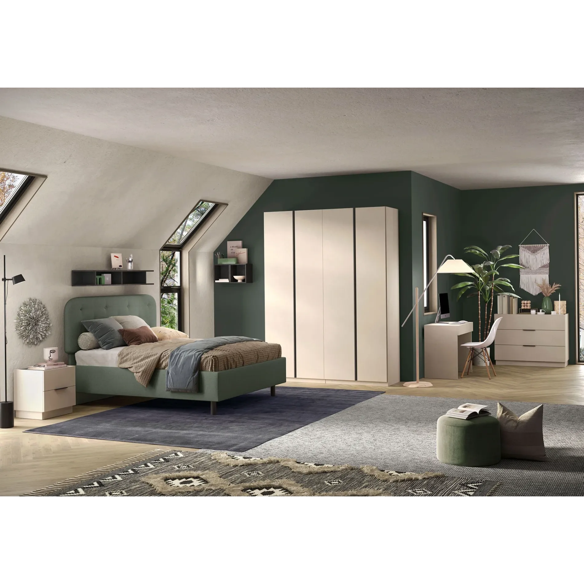 Il letto presenta un design semplice che viene valorizzato da una particolare lavorazione in testata. Il tessuto Verde salvia crea un piacevole contrasto con il resto dell'arredo e conferisce alla cameretta un tocco colorato.