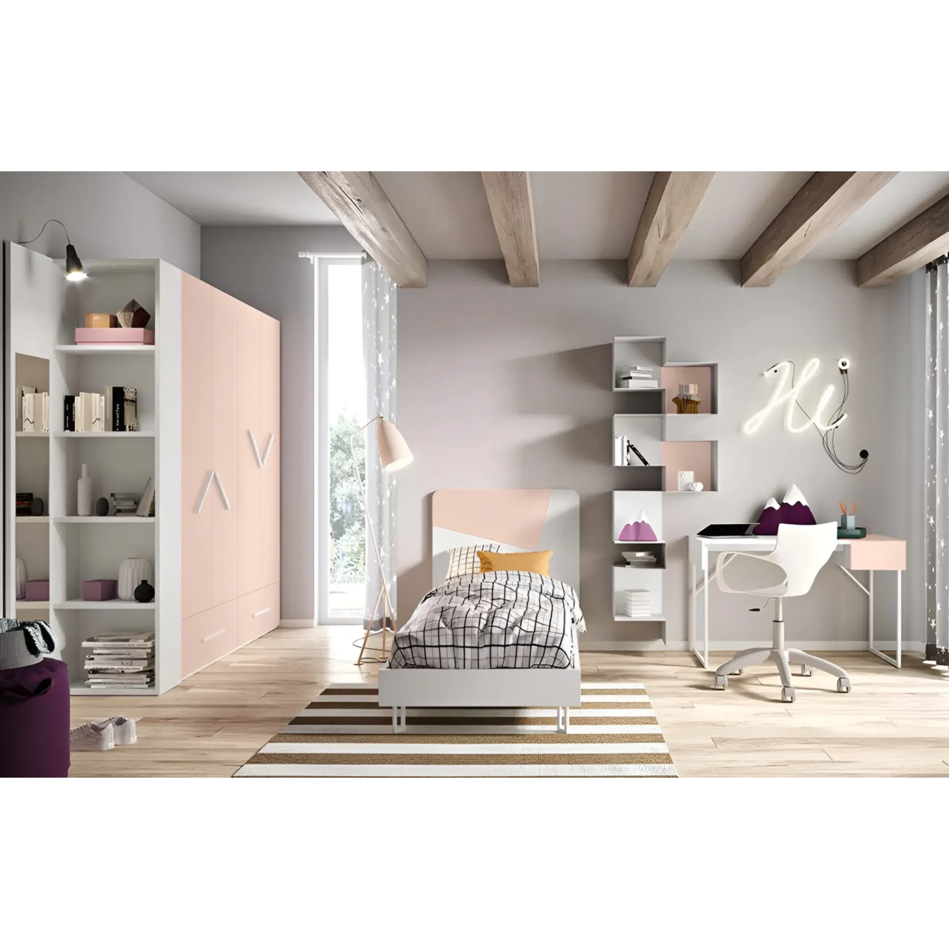 Una soluzione moderna e innovativa, ideale per bambine e teenager che desiderano una cameretta funzionale e ricercata. Le finiture proposte sono in Bianco frassino e Peonia, è possibile personalizzare la cameretta scegliendo attraverso numerose finiture per adattarla al meglio ai propri gusti.