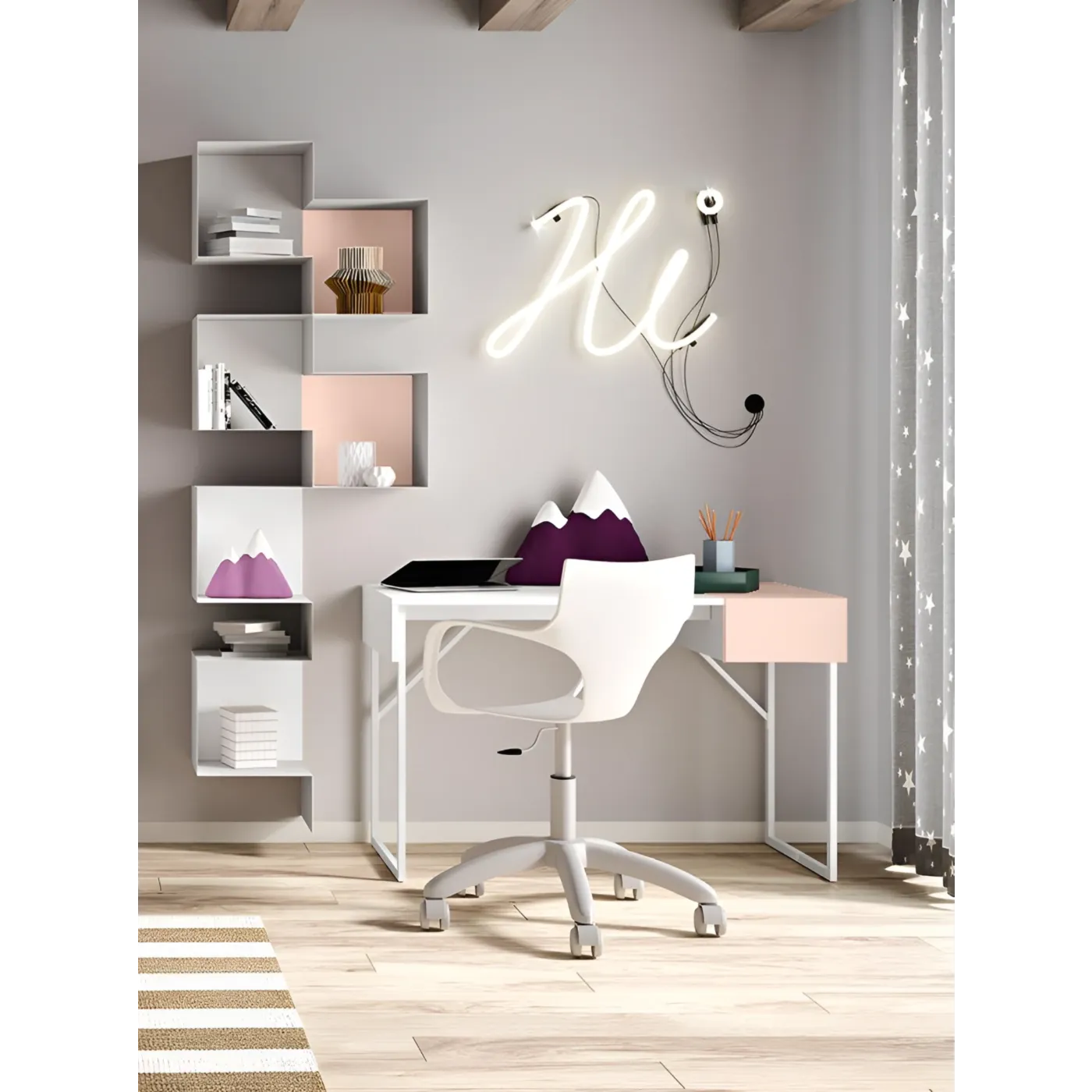 Abbiamo pensato ad un design innovativo che offrisse comodità senza limitarne l'estetica, per questo la scrivania Calamaio presenta una colorata ribalta cipria larga 32 cm. Come optional è possibile richiedere i 3 pensili snake che formano una libreria sospesa, sono posizionabili sia orizzontalmente che verticalmente, la loro portata massima è di 10 kg.