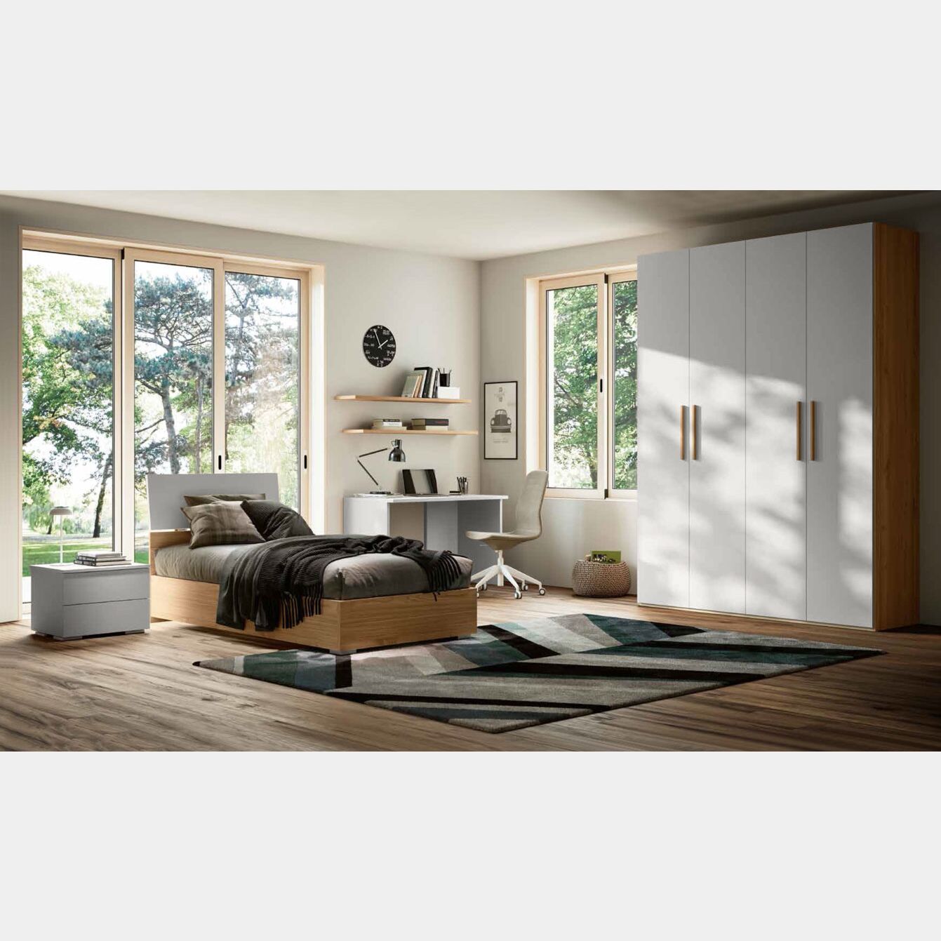 La camera da letto è composta da un armadio a quattro ante battenti, un letto singolo, un comodino ed una pratica libreria. Le finiture proposte sono Bianco nobilitato e Noce biondo. L'accostamento delle due tonalità genera un piacevole contrasto che evidenzia la morbida linea dei complementi, valorizzandone l'estetica, rigorosamente Made in Italy.