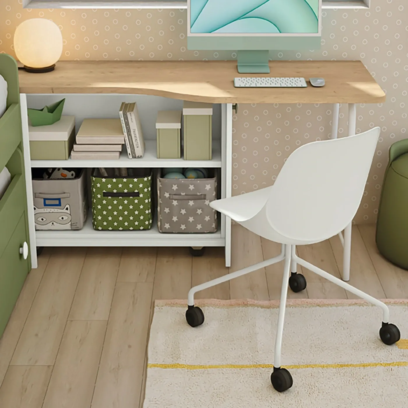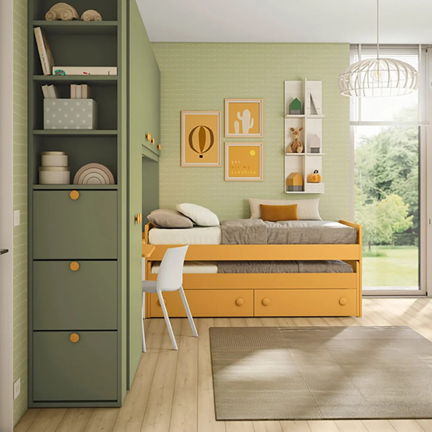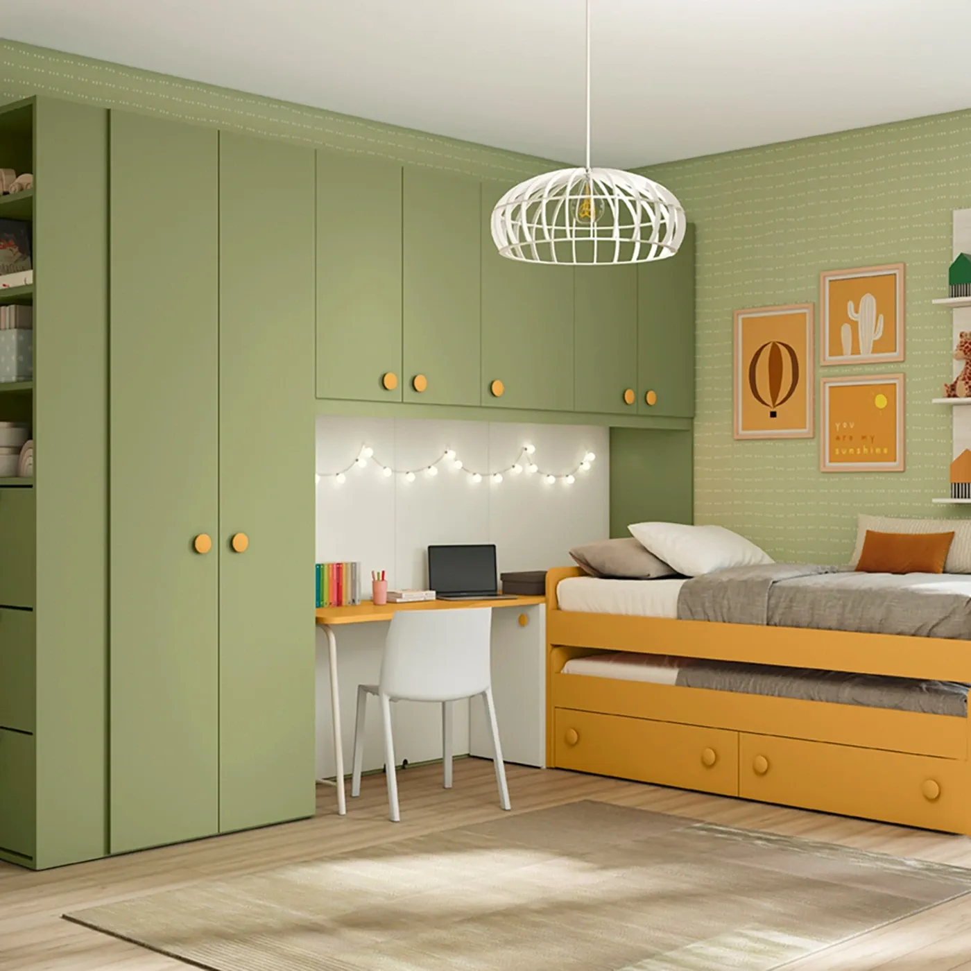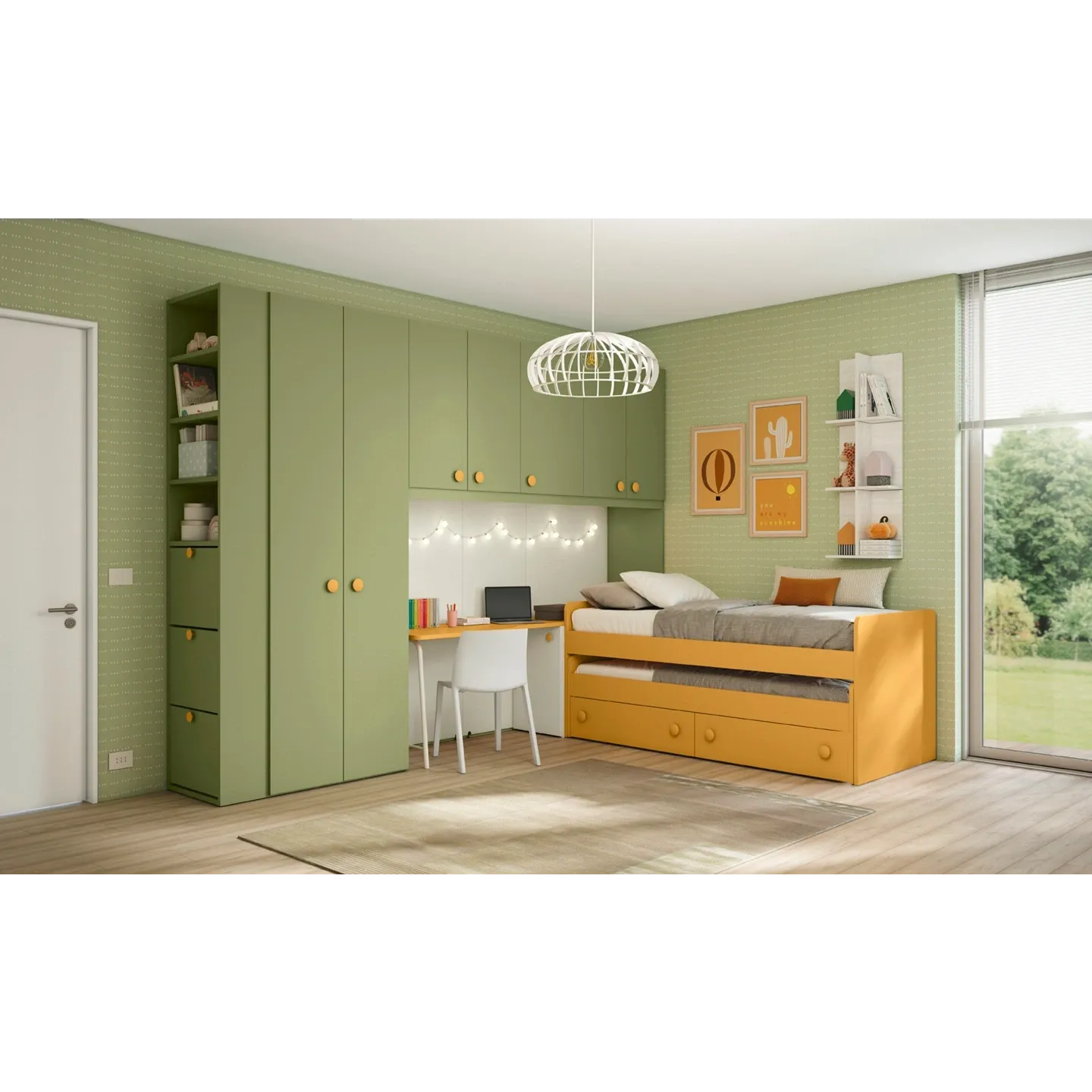 Cameretta con Armadio a Ponte e scrivania con carrello, Oliva, Miele e Rovere bianco