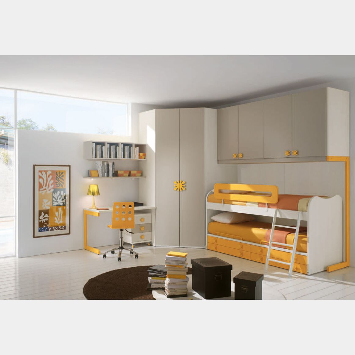 La cameretta è la soluzione ideale per uno spazio ridotto: risulta estremamente pratica e funzionale. L'armadio ad angolo è proggettato per offrire un'ampia capienza sfruttando lo spazio fino al centimetro. Il letto a castello è dotato di un secondo letto ad estrazione con 2 cassettoni. La delicata finitura in Larice incontra quella Zafferano, il contrasto caldo e pulito permette alla camera di risultare accogliente e a misura di bambino. E' possibile modificare le finiture scegliendo tra un'ampia gamma di colori accesi e frizzanti oppure più neutri (le finiture sono in laccato, escluse quelle essenza).