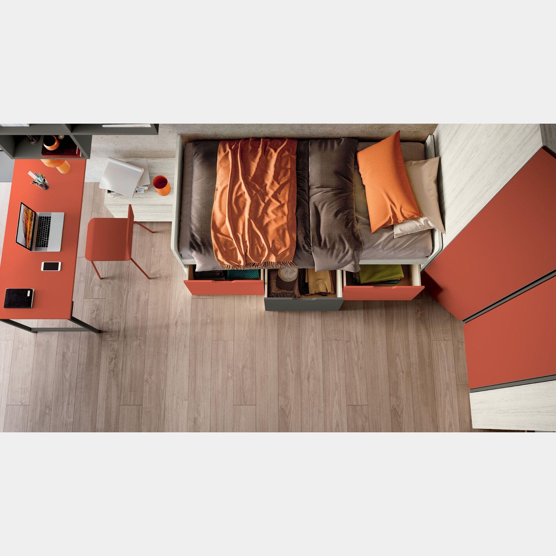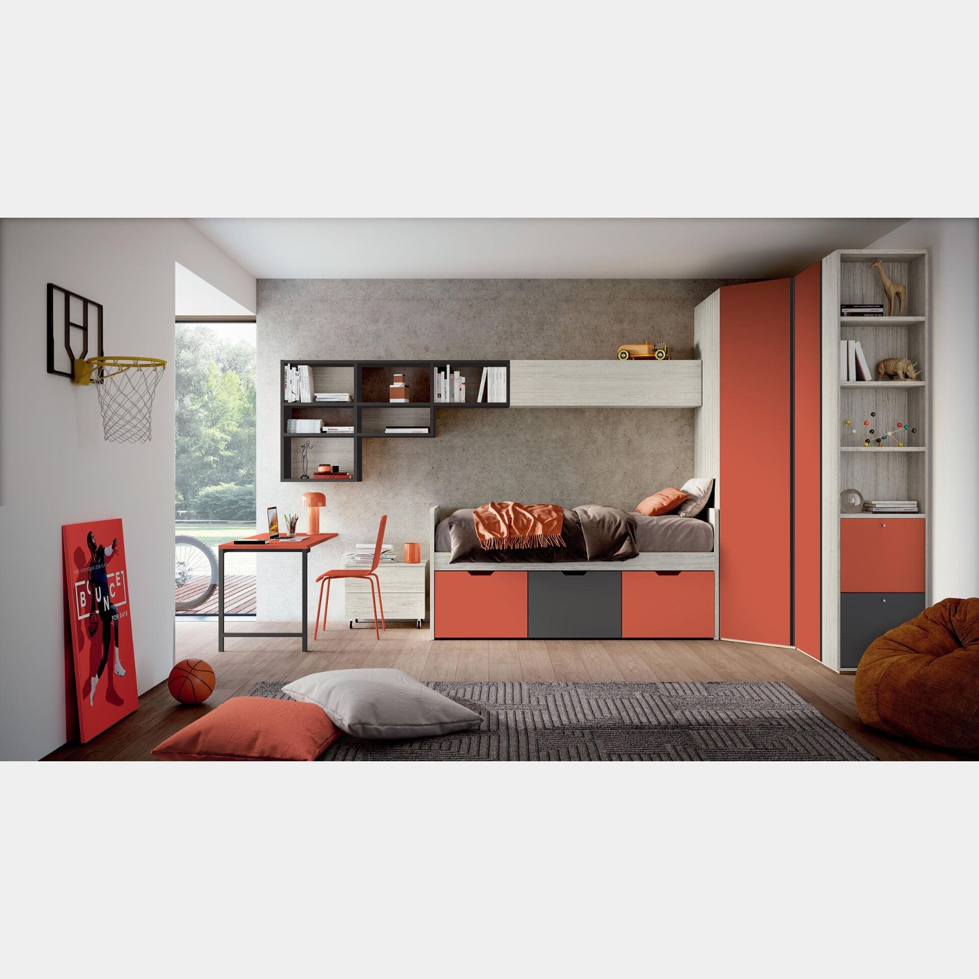 Una cameretta allegra e frizzante, pronta a stupire ed accogliere i più piccoli. La cameretta infatti diventa una perfetta soluzione anche per gli ambienti dalle dimensioni ridotte grazie ad elementi che sfruttano a pieno lo spazio, come l'armadio angolare ed i cassettoni del divano letto. Le finiture in Bianco altea, Grigio cenere e Corallo sono personalizzabilli!