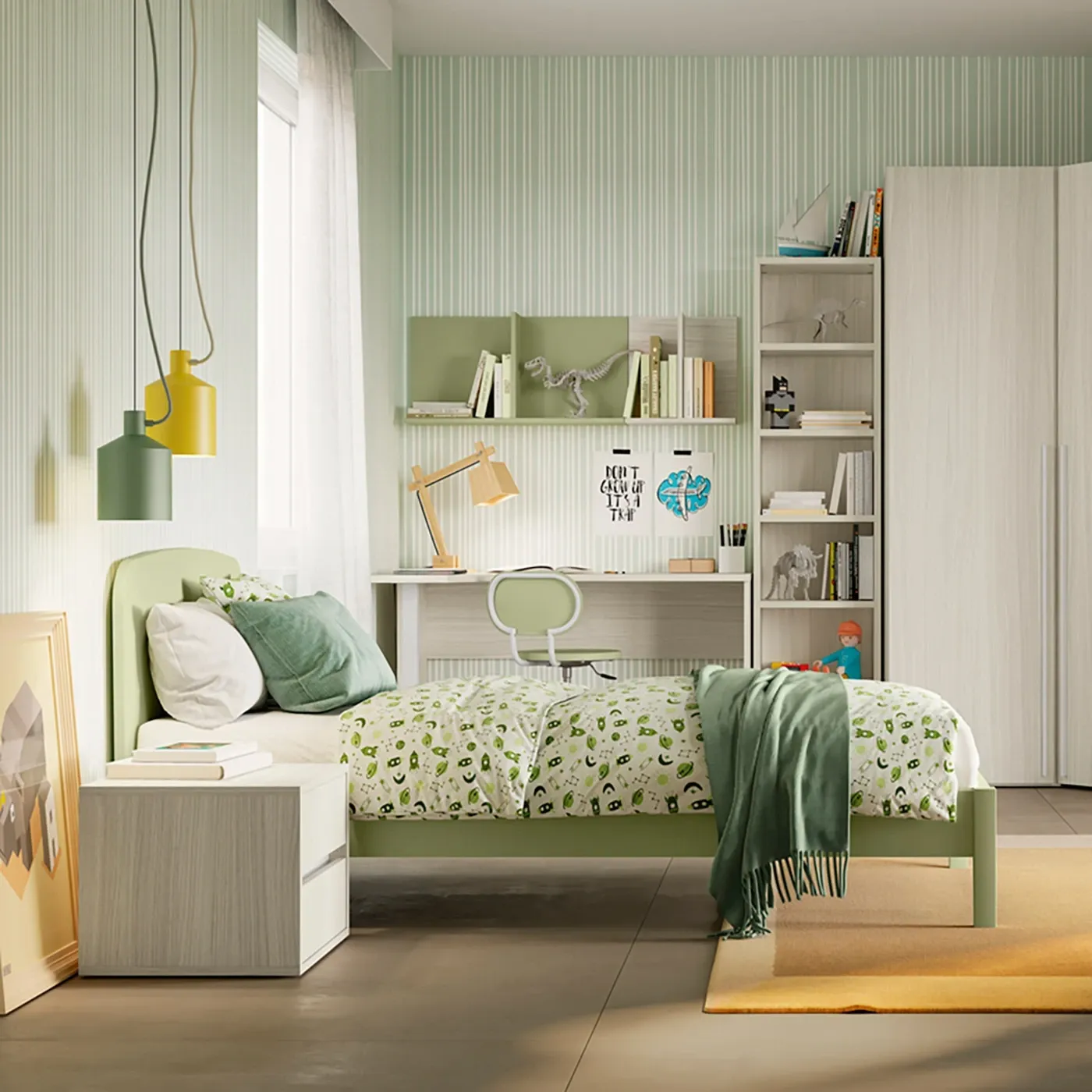 Cameretta che si compone di un armadio con cabina angolare modulabile e 2 libreria terminale, una zona studio con pensili sospesi ed un letto singolo.